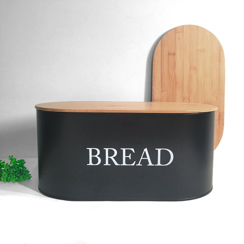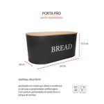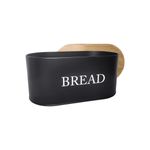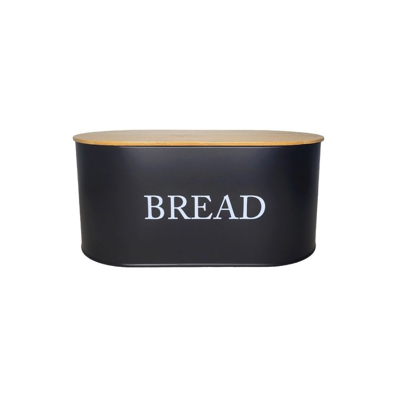 Porta pao preto com tampa. Pote produzido em aço carbono e tampa de bambu. O porta mantimentos possui pintura galvanizada interna e externa na mesma cor. O porta pao possui acabamento resistente a corrosao e propriedades antiferrugem. Contem: 1 Porta Pao Medidas: 34 x 18 x 15,5 cm Material: aço carbono e bambu Peso: 1000g