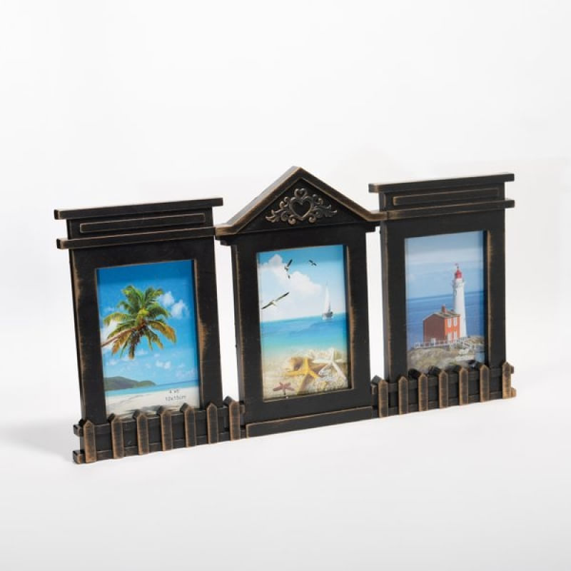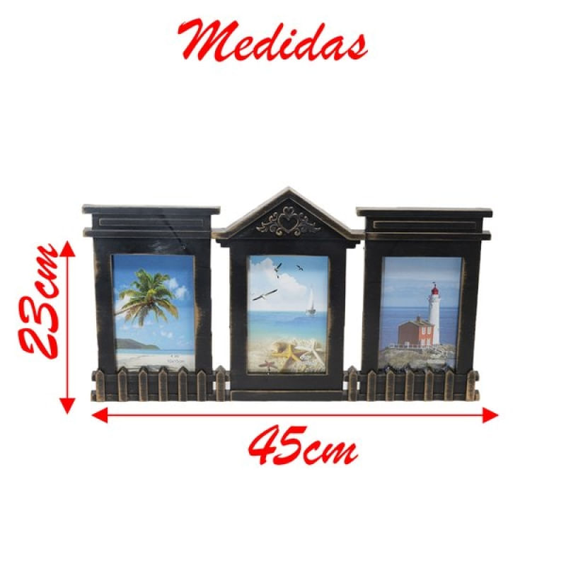 Porta Retrato Quadro De Parede Mural Triplo Preto 23x45cm - Porta Retrato Triplo Preto O acabamento preto oferece uma borda neutra e sofisticada, permitindo que as imagens no interior sejam o foco principal, enquanto ainda acrescenta um toque de elegância ao ambiente. Fácil de pendurar, este quadro mural triplo é não apenas funcional, mas também uma peça decorativa que eleva e personaliza seu espaço. Seja para relembrar momentos especiais, exibir retratos de família ou criar uma colagem artística, o Porta Retrato Quadro de Parede Mural Triplo é a escolha perfeita para quem busca um design sofisticado e uma maneira inovadora de apresentar memórias. Transforme sua parede em uma galeria de momentos inesquecíveis! Características: Altura: 23cm; Largura: 45cm; Cor: Preto com detalhes em Dourado; Material: Plástico; Espaço para até 3 fotos 10x15xm Conteúdo da embalagem: • 1 Porta Retrato Triplo Preto 23x45xm; Características Gerais do Produto: • Material: Plástico • Modelo: Porta Retrato Triplo Fotos 10x15cm • Cor: Dourado; Preto • Dimensões aproximadas: Altura de 23cm X 45cm de Largura Garantia: • Garantia do site - 1 Mês