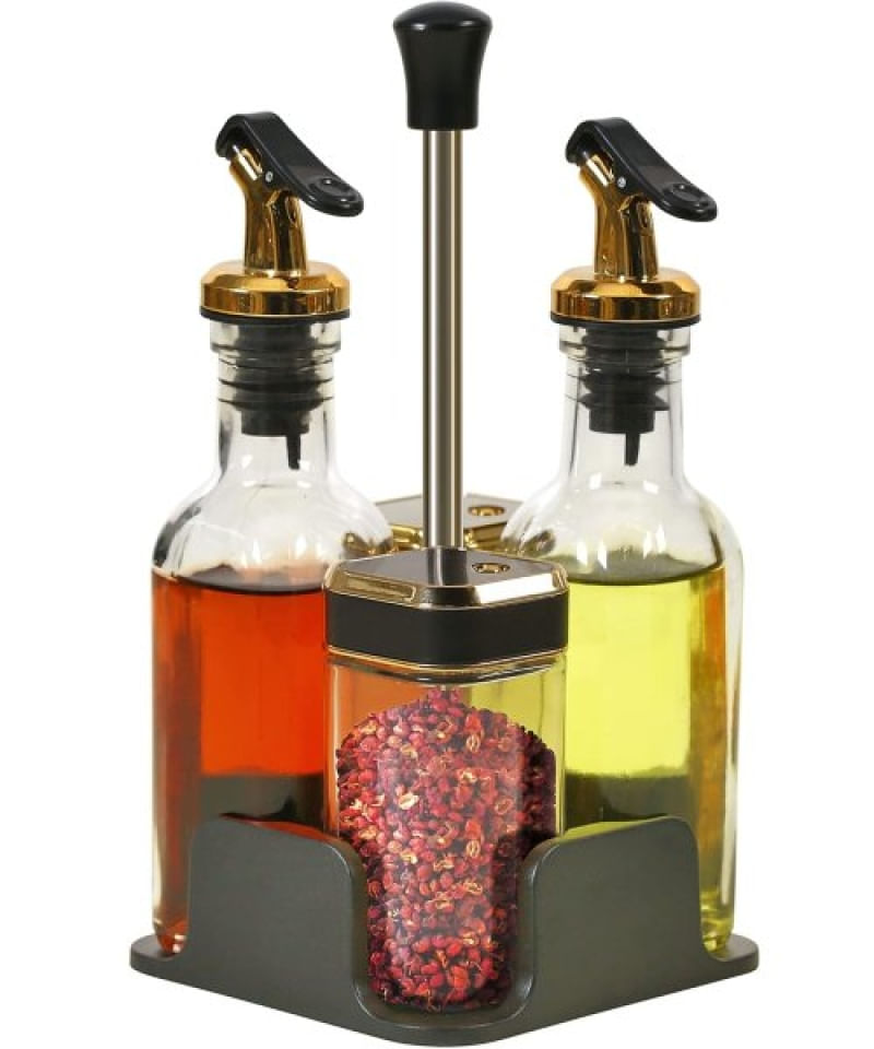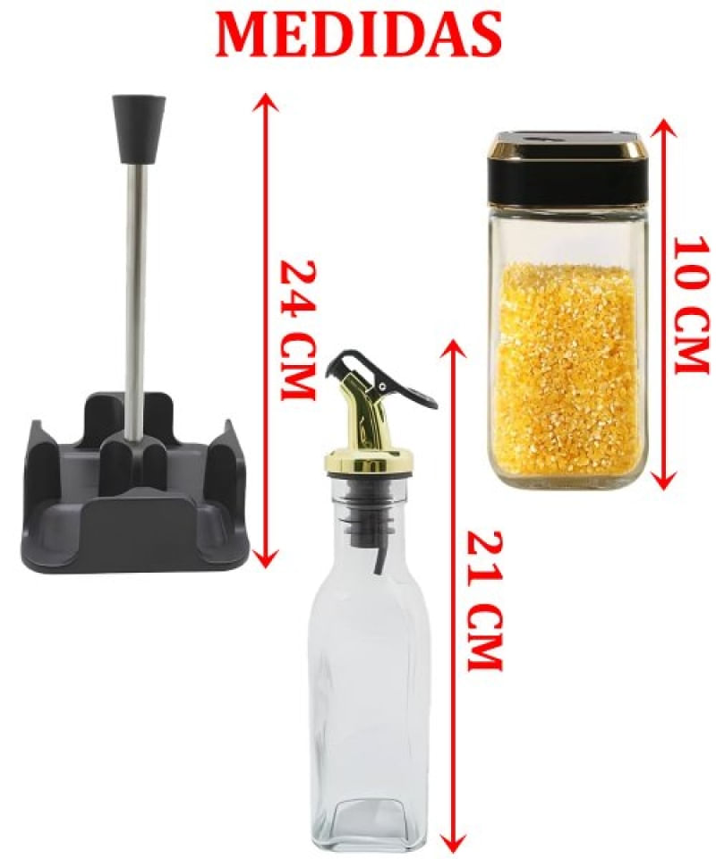 Porta Temperos Condimentos Galheteiro Dourado Suporte 4Pçs - Porta Temperos e Condimentos Galheteiro Dourado com Suporte + 4 Peças Transforme sua cozinha com nosso elegante Porta Temperos e Condimentos Galheteiro Dourado! Este conjunto não só organiza suas especiarias, mas também adiciona um toque de sofisticação ao seu espaço. Acabamento dourado que traz charme e estilo à sua cozinha, Acompanha 4 potes, perfeitos para armazenar seus temperos favoritos Especificações: Material: Vidro; Cores: Transparente, Preto E Dourado; Medidas: Suporte 24cm X Galheteiros 21cm X Porta Temperos 10cm; Conteúdo Da Embalagem: 1 Porta Temperos Com 4 Pçs + Suporte Condimentos Galheteiro Dourado; Características Gerais do Produto: • Material: Vidro • Modelo: Porta Tempeiros • Cor: Dourado; Preto; Transparente • Dimensões aproximadas: Suporte 24cm X Galheteiros 21cm X Porta Temperos 10cm Garantia: • Garantia do site - 1 Mês
