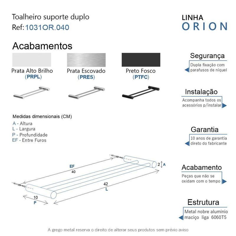 Porta Toalha Toalheiro Duplo Rosto Para Banheiro Alto Brilho Orion 40cmO porta toalhas toalheiro duplo da linha Orion possui um design versátil, é uma peça que se destaca com minimalismo. ;Além de decorar, organiza com funcionalidade o banheiro. Criado em metal nobre com uma qualidade que abrange áreas litorâneas e possui a garantia de um acabamento muito resistente. ;Agora é só você adquirir este lindo acessório e fazer o seu projeto se tornar realidade com um banheiro prático para toda a sua família.CARACTERÍSTICAS ;• Fabricado em metal alumínio.• Disponível no Prata Alto Brilho, Escovado e Preto Fosco.• Pode ser instalado em parede, azulejo e porcelanato.BENEFÍCIOS• Fixação prática e segura com parafusos e buchas inclusos.• O produto não possui nenhum detalhe em plástico (ABS).• Fácil higienização, ideal para locais que exigem limpeza constante.• Aproveitamento inteligente do espaço, ideal para ambientes compactos.• Resistente à corrosão e luz solar.ITENS ENVIADOS: 1 toalheiro duplo 40cm, kit de parafusos e manual instrução instalação.INSTALAÇÃO INTELIGENTEAo 1º furo, use uma broca medida menor, após use a medida correta e finalize, vai ajudar na precisão da fixação da bucha principalmente em azulejos e porcelanato.
