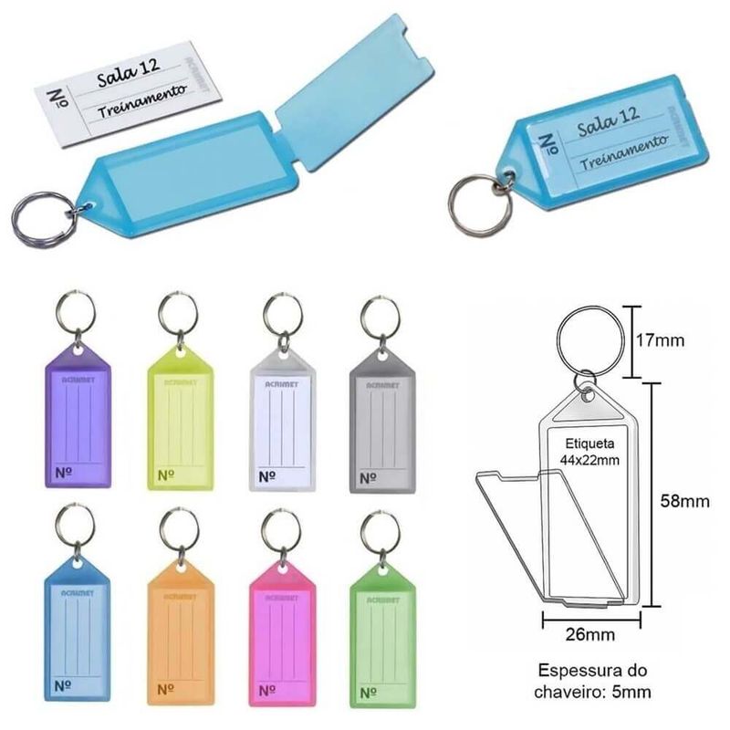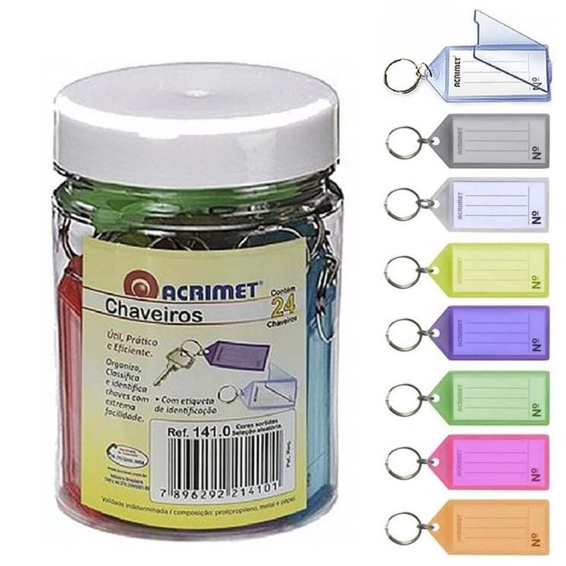 Pote com 24 Chaveiros Plásticos com Etiqueta (Ref. 141.0) - Acrimet Organize todas as suas chaves de forma rápida e fácil. Pote com 24 chaveiros feitos de plástico durável em cores variadas com anel de metal e etiqueta de papel para identificação. Detalhes: - Útil, prático e eficiente. - Organiza, classifica e identifica chaves com extrema facilidade. - Com etiqueta de identificação. - Cores Sortidas. - Vem em um recipiente de plástico transparente reutilizável - Fácil de identificar: abra, escreva, feche e pronto! - Indicado para armários, casa, escritório, escola, condomínios, locadoras de veículos, concessionárias de carros, hotéis, imobiliárias e muito mais. Conteúdo da embalagem: 01 pote com 24 unidades Imagens meramente ilustrativas, as cores podem variar em cada tela ou monitor.