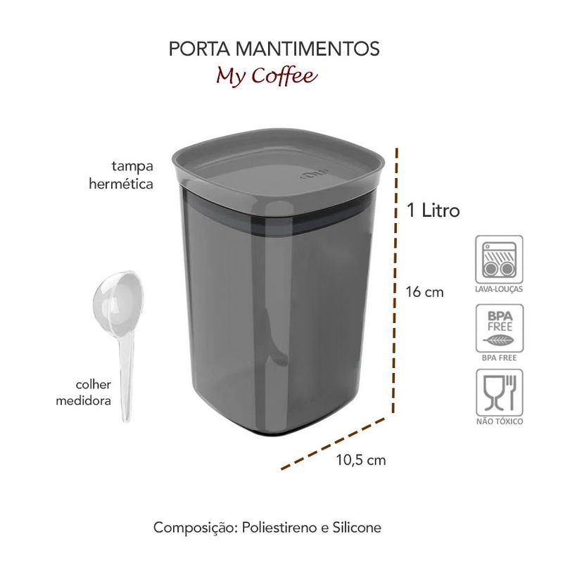 Pote com vedaçao hermetica. O porta mantimentos ajuda a preservar o aroma e sabor do cafe mantendo suas caracteristicas por mais tempo. Seu design foi pensado para que os potes sejam empilhados e facilmente abertos, com cantos arredondados que proporcionam uma pegada confortavel e ergonomica. Alem de possuir anel de vedaçao feito em silicone com tecnologia que permite abertura suave e vedaçao perfeita. Produzido livre de Bisfenol A (BPA FREE), vai a lava-louças e sugere-se higienizar com sabao neutro e esponja macia, evitando produtos abrasivos no processo de limpeza. Contem: 1 Colher Medidora 1 Porta Mantimentos Medidas: 16 x 10,5 cm Capacidade: 1 litro Composição: PS e Silicone