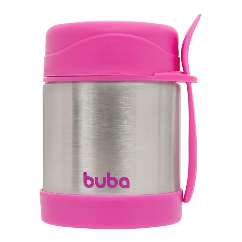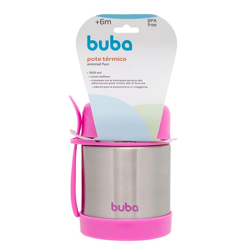 Pote Térmico Aço Inox com Talher Buba O pote térmico inox Buba veio para facilitar a vida dos pequenos no momento da refeição. Possui capacidade para 350ml, feito em aço inoxidável no interior e exterior, mantém a temperatura quente ou fria dos alimentos por mais tempo (aproximadamente 5 horas). Tampa a prova de vazamentos com grip macio para fácil abertura e boca larga que facilita a entrada e a retirada da comida. E ainda é resistente, higiênico e fácil de limpar. O pote térmico pode ser utilizado para papinhas, sopas, frutas, legumes... conservando a comida fria por aproximadamente 5 horas. Perfeito para passeios, viagens e escola. Características do Pote Térmico de Inox: Indicado para uso a partir de 6 meses de idade; Acompanha talher; Capacidade de 350 ml; Livre de BPA; Dimensões Aproximadas: 10 x 11 x 11 cm.