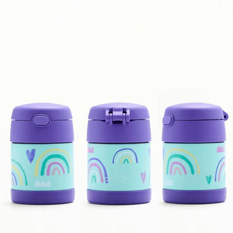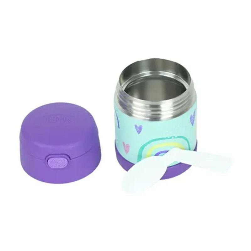 POTE TÉRMICO FUNTAINER F310 ARCO-IRIS 290ML - THERMOS O Pote Térmico Infantil Thermos Funtainer F310 Arco-Íris - 290 ml de capacidade, combina beleza e funcionalidade para o dia a dia das crianças. Desenvolvido para pais que buscam praticidade e segurança, ele mantém a temperatura ideal de alimentos quentes por até 5 horas e frios por até 7 horas, tornando-se um item indispensável para garantir lanches e refeições frescas e saborosas a qualquer hora. Com a exclusiva tecnologia de isolamento a vácuo Thermos, este pote é feito em aço inoxidável com parede dupla, o que garante resistência a quedas, segurança ao toque e durabilidade. A parte externa não esquenta ao toque quando há alimentos quentes e não transpira com alimentos frios, proporcionando conforto e segurança para as crianças.O Funtainer F310 acompanha colher embutida, pensada para facilitar ainda mais o consumo das refeições. Com design compacto e antivazamento, ele é perfeito para levar à escola, passeios, viagens, ou qualquer momento em que a criança precise de uma refeição prática e saborosa. Além disso, é totalmente livre de BPA, garantindo que o contato com o alimento seja seguro e saudável.Escolher o Pote Térmico Thermos Funtainer F310 é optar pela melhor qualidade e pela confiança de uma marca referência no mercado. Com estampas divertidas e exclusivas, ele pode ser combinado com garrafinhas e lancheiras Thermos para um conjunto completo e prático. ESPECIFICAÇÕES TÉCNICASMaterial: Aço inoxidável e plástico BPA Free (livre de Bisfenol A) Retenção para frio: 7 horas Retenção para quente: 5 horas Capacidade: 290 ml Cor principal: Rosa Estampa: Arco-íris Peso: 240g Garantia: 5 anos contra defeitos de fabricação Conteúdo: 1 Pote Térmico Thermos F310 com tampa e colher interna