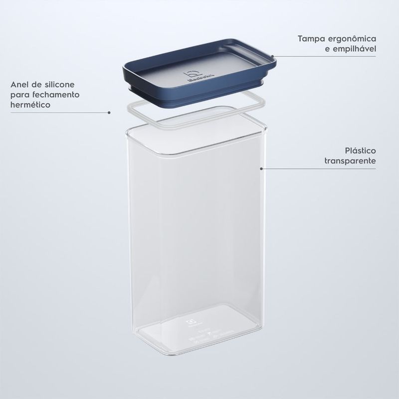 Pote Hermético Electrolux Experience 2,5 L Sua casa sempre organizada e com estilo O Pote Hermético Electrolux Experience ajuda a manter seus armários sempre organizados, além de poder ser utilizado em conjunto com outros produtos da mesma linha. Ideal para uma casa organizada e com estilo. Multifuncional de verdade Ideal para armazenar alimentos secos como macarrão, cereais, biscoitos e sementes, assim como a perfeita organização de outros ambientes da casa como produtos de higiene pessoal, de escritório, entre outros. Mais praticidade e organização Feito de material BPA Free, de alta qualidade e resistência, excelente transparência, facilitando a visualização do conteúdo sem a necessidade de abertura da tampa. Fechamento hermético Com vedação de silicone, possui selagem perfeita que preserva as características, texturas e aromas dos alimentos por muito mais tempo, além de otimizar o armazenamento e a organização de diferentes ambientes e espaços. Informações técnicas 1 Pote Hermético com Tampa 9,5 x 25,4 x 14,3 centímetros | 2,5 litros O Pote Hermético Electrolux Experience pode ser usado na geladeira. Não deve ser utilizado no micro-ondas, freezer, lava-louças e em altas temperaturas. Produto testado para contato com alimentos conforme resoluções da ANVISA.
