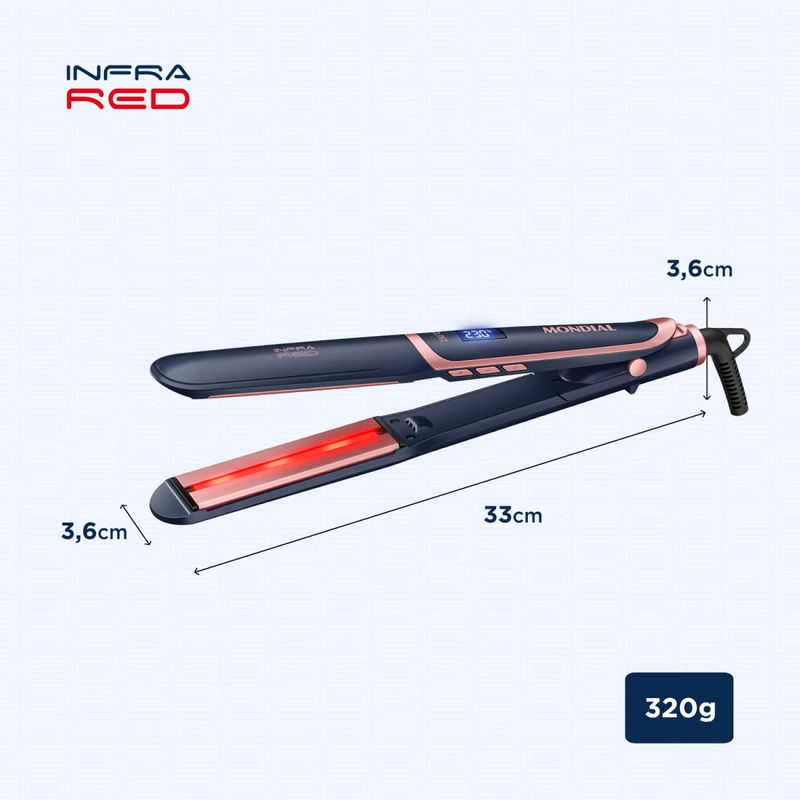 Com a Prancha Alisadora da Linha Infrared da Mondial, você vai modelar o cabelo com a eficiência e a proteção da tecnologia de ondas infravermelhas. As ondas penetram nos fios e agem de dentro para fora, acelerando o alisamento enquanto preservam a camada externa do cabelo. A prancha também tem chapas de cerâmica com Tourmaline Íon, tecnologia que libera íons e deixa os cabelos mais macios e com brilho intenso. Saiba mais sobre a P-01-IR Mondial: TECNOLOGIA INFRARED: Emite ondas infravermelhas que penetram nos fios e agem de dentro para fora, acelerando a modelagem, enquanto preservam a camada externa do cabelo. Garantia de mais proteção e brilho na sua rotina capilar! CHAPAS DE CERÂMICA COM TOURMALINE ÍON: As placas têm revestimento de cerâmica com Tourmaline Íon, tecnologia que libera íons e sela a cutícula dos fios, deixando-os disciplinados, macios e com brilho intenso. PAINEL DIGITAL COM CONTROLE DE TEMPERATURA: Ajustes de 110°C a 230°C para um alisamento perfeito e adequado aos diferentes tipos de cabelo. BIVOLT AUTOMÁTICO: Pode ser utilizada em ambas as voltagens: 127V e 220V. Liberdade de usar sua prancha em qualquer lugar! CABO GIRATÓRIO DE 1,8 METROS: O cabo-plugue tem 1,8 metros de comprimento e gira 360°, garantindo mais autonomia de movimento. TRAVA DE SEGURANÇA: Proporciona mais segurança e praticidade para guardar e transportar a prancha. UM ANO DE GARANTIA MONDIAL: A Mondial é a escolha de milhões de consumidores. Mondial, a escolha inteligente!