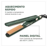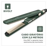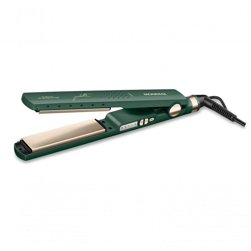 Prancha Alisadora Juliette Mondial P-JU-02 Verde BivoltA Prancha Alisadora da Linha by Juliette Qu4tro Elementos traz um revestimento especial enriquecido com infusão de Cerâmica, Titânio, Tourmaline e Nano Silver. Juntos, esses 4 elementos protegem seus fios e garantem uma aparência mais saudável aos cabelos, com brilho intenso, maciez e sem frizz.Diferenciais do Produto:Revestimento Especial Qu4tro Elementos: A fusão de Cerâmica, Titânio, Tourmaline e Nano Silver distribui o calor uniformemente, protege os fios, reduz o frizz e garante um cabelo com brilho e aparência saudável.Painel Digital com Controle de Temperatura: Oferece 5 opções de temperatura, de 150°C a 230°C, permitindo um alisamento perfeito e adequado para os mais diferentes tipos de cabelo.Aquecimento Rápido e Estável: Atinge a temperatura máxima de 230°C rapidamente e a mantém estável durante todo o uso, garantindo um resultado eficiente.Design Prático e Seguro: O cabo giratório de 2,5 metros garante mais liberdade de movimento, enquanto a trava de segurança permite guardar a prancha de forma prática e segura.Bivolt Automático: Ideal para levar em viagens, pode ser utilizada em ambas as voltagens (110V e 220V) sem a necessidade de ajustar uma chave seletora.Especificações Técnicas:Marca: MondialModelo: by Juliette Qu4tro Elementos P-JU-02Voltagem: BivoltCódigo: P-JU-02Tipo: Prancha Alisadora / ChapinhaNíveis de Temperatura: 5 (150°C a 230°C)Display: LCD DigitalCor: Golden RoséComprimento do Cabo: 2,5 metros (giratório 360°)Revestimento das Chapas: Cerâmica, Titânio, Tourmaline e Nano SilverPeso: 390 gDimensões [AxLxP]: 4 x 31,5 x 3,5 cmGarantia: 12 meses
