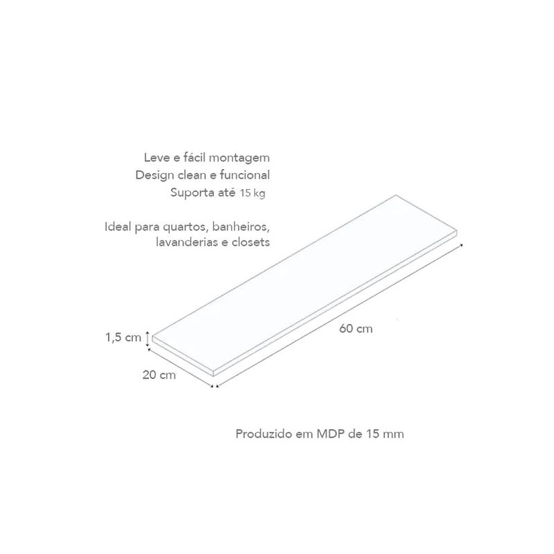 Prateleiras suspensa com suporte invisível. Prateleira de excelente acabamento com design clean e funcional. Leve e de fácil montagem, suporta até 15 kg. Ideal para quartos de bebê, salas, escritórios, closet, lavanderias e banheiros. Contêm: 1 Prateleira Invisível Medidas montada: 60 x 20 x 1,5 cm 1 Prateleira Invisível Medidas montada: 40 x 20 x 1,5 cm Acompanha parafusos e buchas Material: MDP 15mm de espessura Suporta até 15 kg cada prateleira Casacha é uma loja com atendimento exclusivo online, com artigos para casa, cozinha, banheiro e lavanderia.