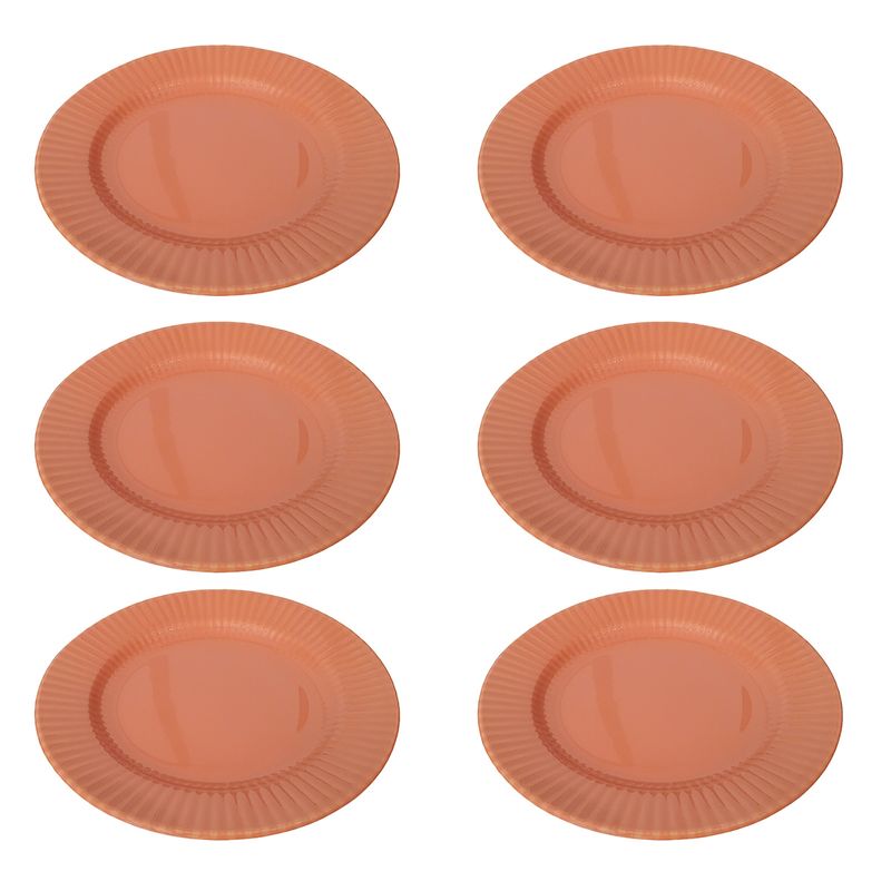Prato Raso de Cerâmica Canelé Salmão 24cm 6 Unidades - Biona 135786 O doce francês Canelé inspirou a coleção que leva o seu nome. A iguaria ganhou o coração dos franceses por ser feita de maneira simples, já que o destaque fica para o seu formato canelado, relevo que foi aplicado na aba dos pratos da coleção. Na decoração Salmão, o tom suave de laranja inspira a imaginação e deixa a mesa posta mais aconchegante. Características do Produto: Fabricante: Oxford Marca: Biona Material do Produto: Cerâmica Tipo: Raso Cor: Salmão Conteúdo da Embalagem: 6 Unidades Uso: Resistente a micro-ondas e resistente a lava-louças Linha: Canelé Formato: Redondo Diâmetro: 24 cm Altura: 3 cm Garantia de Fabricação: 90 dias (Defeitos de fabricação). Recomendações de uso: Ao usar o produto pela primeira vez, lavar bem a peça com esponja macia e sabão neutro; Lavar as peças utilizando esponja macia e sabão neutro; Não levar as peças ao forno; Não submeter as peças a chama direta. Todas as imagens são meramente ilustrativas.
