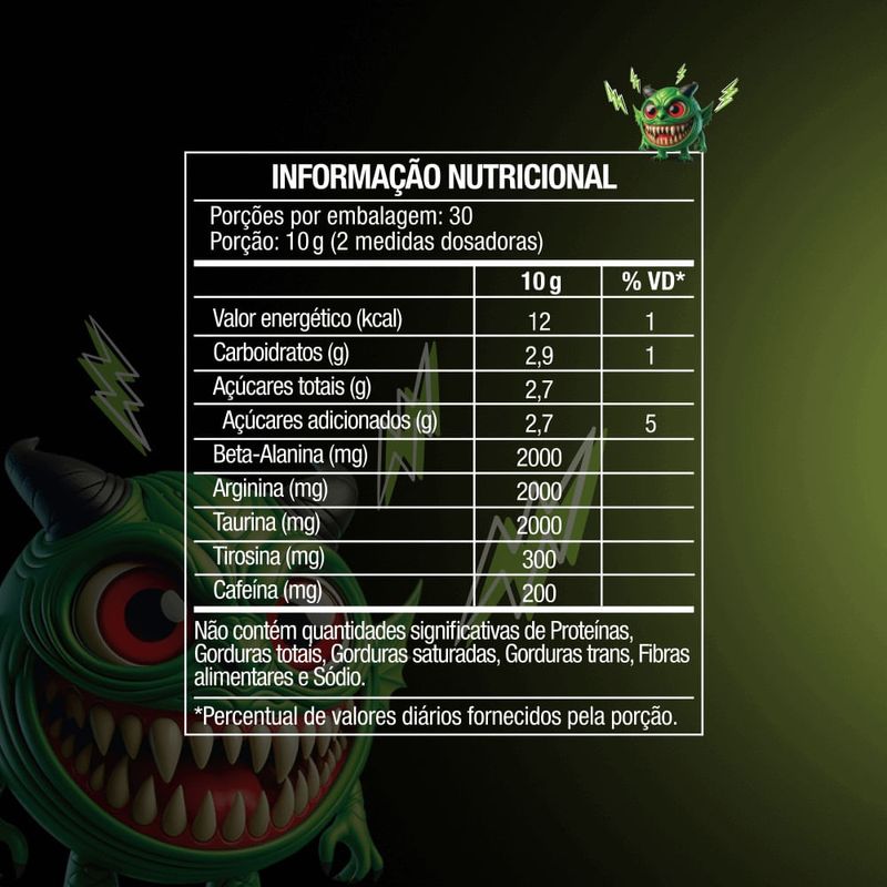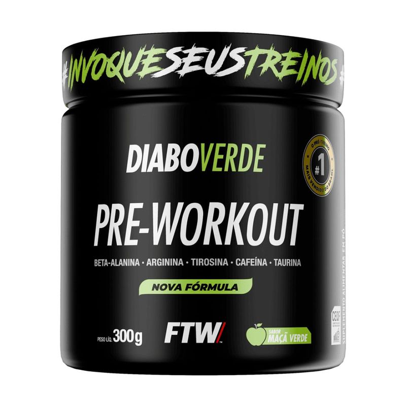 Pré Treino Diabo Verde Sabor Maçã Verde 300g O Pré Treino Diabo Verde Sabor Maçã Verde 300g foi desenvolvido para quem busca alto desempenho físico, mais foco mental e energia consistente antes dos treinos. Sua fórmula estratégica combina aminoácidos essenciais e cafeína microencapsulada, promovendo estímulo eficiente e controlado. Com sabor Maçã Verde, refrescante e levemente ácido, oferece uma experiência agradável mesmo nos treinos mais intensos. Para que serve? Aumenta a energia e a disposição A cafeína microencapsulada garante liberação gradual, proporcionando energia prolongada sem picos abruptos. Melhora o foco e a concentração mental A L-tirosina auxilia na atenção e no desempenho cognitivo, ideal para treinos de alta exigência. Auxilia na resistência muscular e no rendimento físico A beta-alanina, em conjunto com arginina e taurina, ajuda a retardar a fadiga muscular. Indicado para treinos intensos e explosivos Ideal para musculação, cross training, HIIT, corrida e atividades de alta intensidade. Diferenciais Fórmula com aminoácidos + cafeína Cafeína microencapsulada para energia progressiva Contém isomaltulose, fonte de energia de liberação lenta Rendimento de aproximadamente 30 porções Sabor Maçã Verde Não contém glúten Desenvolvido conforme boas práticas de segurança em suplementos alimentares Ingredientes Isomaltulose, beta-alanina, L-arginina, L-taurina, L-tirosina, cafeína microencapsulada, antiumectante fosfato tricálcico, acidulante ácido cítrico, edulcorantes sucralose e acessulfame de potássio, aromatizante e corante (conforme o sabor). Como Consumir Diluir 2 medidas dosadoras (10g) em 200ml de água gelada. Consumir cerca de 30 minutos antes da atividade física. A dose diária máxima de beta-alanina é de 2g, podendo ser fracionada com intervalo mínimo de 2 horas. Informações Importantes de Segurança Indicado para adultos (≥ 19 anos) Este produto não é um medicamento Não exceder a recomendação diária de consumo Não indicado para gestantes, lactantes e crianças Manter fora do alcance de crianças Conservar ao abrigo da luz, calor e umidade Após aberto, consumir em até 45 dias