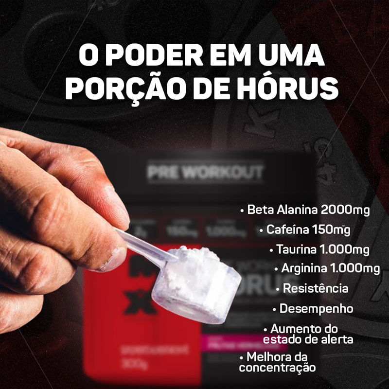 HÓRUS é um produto para ser consumido no pré treino.Para quem se exercita com intensidade, a fadiga é um dos principais fatores que influenciam o rendimento, por isso desenvolvemos o HÓRUS: com formulação altamente tecnológica e ingredientes de altíssima qualidade, para você ter um treino com muitomais eficiência.Benefícios:• Pré Workout• Resistência• Desempenho• Beta Alanina 2g• Taurina 1.000mg• Arginina 1.000mg• Cafeína 150mg: auxilia no aumento do estado de alerta e na melhora da concentração