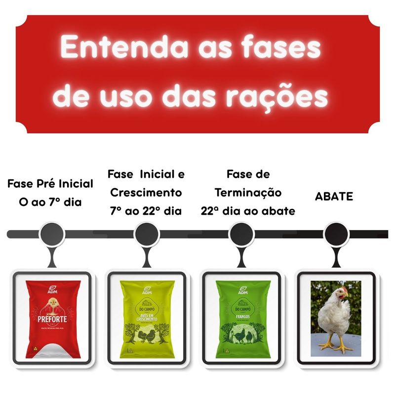 Kit 4 un Ração ADM PRÉFORTE | Ração Pré Inicial Para Aves 5 kg - 20kg totalRevendedor Autorizado ADM PRÉFORTE é uma ração pré-inicial completa, altamente nutritiva e balanceada, desenvolvida para frangos de corte na fase pré-inicial e aves de reposição do 1º ao 21º dia de vida. Trata-se de um alimento pronto para uso, formulado para garantir arranque inicial forte, excelente desenvolvimento intestinal, melhor aproveitamento dos nutrientes e desempenho zootécnico superior desde os primeiros dias. Por que usar PRÉFORTEA nutrição e o manejo nos primeiros dias de vida são decisivos para o desempenho final das aves. PRÉFORTE foi formulada com alto teor proteico, aminoácidos essenciais como lisina, metionina e treonina, vitaminas, minerais orgânicos, enzimas, probióticos e aditivos funcionais que favorecem crescimento rápido e uniforme, melhor conversão alimentar, fortalecimento do sistema digestivo e suporte ao sistema imunológico. É uma solução prática e segura, que dispensa misturas caseiras e garante padronização nutricional tanto para pequenos criadores quanto para sistemas produtivos mais tecnificados. ADM PRÉFORTE é a escolha ideal para quem busca segurança nutricional, desempenho inicial consistente e confiança técnica. Um produto desenvolvido com tecnologia avançada por um grupo global de referência em nutrição animal, transformando os primeiros dias das aves em base sólida para produtividade e eficiência ao longo de todo o ciclo de criação. Descrição do ProdutoMarca: ADMLinha: PréforteCategoria: Ração pré-inicial para avesPeso Líquido: 5 kgIndicação: Alimentação de frangos de corte na fase pré-inicial e aves de reposição do 1º ao 21º dia de vida. Composição BásicaMilho moído, farelo de soja, calcário calcítico, fosfato bicálcico, cloreto de sódio, complexo cobre aminoácido, complexo manganês aminoácido, complexo zinco aminoácido, sulfato de ferro, sulfato de cobre, monóxido de manganês, óxido de zinco, iodato de cálcio, sulfato de cobalto, selenito de sódio, vitaminas A, D3, E, K3, B1, B2, B3, B5, B6, B9, biotina, B12 e C, L-lisina, DL-metionina, L-treonina, cloreto de colina, carvacrol, dextrina, butirato de sódio, ácidos orgânicos, antioxidantes, aditivo enzimático, aditivo probiótico e nicarbazina. Níveis de Garantia (por kg do produto)Umidade (máx.): 130 gProteína bruta (mín.): 230 gExtrato etéreo (mín.): 30 gFibra bruta (máx.): 45 gMatéria mineral (máx.): 100 gCálcio (mín.): 9.000 mg / (máx.): 12.000 mgFósforo (mín.): 6.000 mgVitaminas, minerais, aminoácidos, enzimas e probióticos conforme rotulagem oficial do fabricante. Modo de UsoPara frangos de corte: fornecer de 150 a 250 g de ração por ave.Para aves de reposição: fornecer de 300 a 400 g por ave ou conforme orientação técnica.Disponibilizar ração e água limpa à vontade desde o alojamento. O manejo inicial correto é fundamental para o desempenho das aves. RestriçõesPeríodo de carência para aves de abate: o abate somente deve ser realizado 12 dias após a última aplicação. Não utilizar em poedeiras em produção de ovos para consumo humano ou em reprodutoras. ConservaçãoConservar em local seco e arejado, sobre estrados, afastado de paredes e devidamente embalado. Não armazenar junto a produtos tóxicos. Informação RegulatóriaProduto isento de registro no Ministério da Agricultura e Pecuária, conforme legislação vigente para alimentação animal. Estabelecimento fabricante registrado no MAPA. Indústria Brasileira. Sobre a ADMA ADM (Archer Daniels Midland) é uma das maiores empresas globais de nutrição humana e animal, com mais de um século de atuação. No Brasil, atua por meio de sua divisão de nutrição animal, incorporando a expertise da Neovia, grupo reconhecido mundialmente por inovação, ciência e tecnologia em alimentação animal. O resultado é um portfólio confiável, desenvolvido para gerar eficiência, segurança e sustentabilidade no campo. OBS: Na quantidade de 20kg serão enviados 4 sacos de 5kg ou uma saca de 20kg, conforme disponibilidade no momento do pedido.
