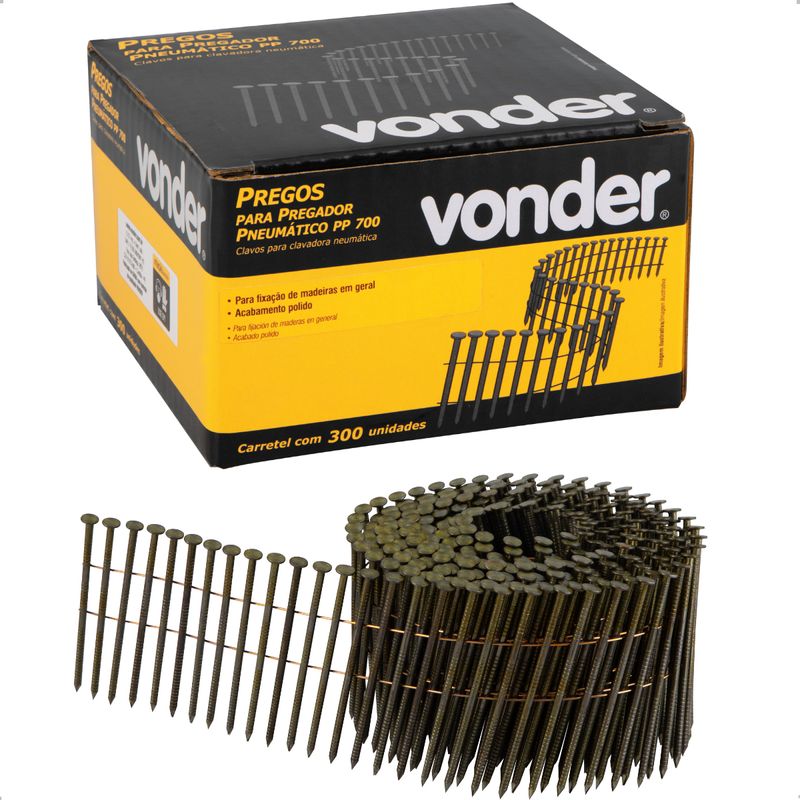 Prego Anelado Vonder 70 mm PP700 Polido com 300 Peças - Vonder OficialO Prego Anelado Vonder 70 mm PP700 Polido com 300 Peças é o parceiro ideal para quem busca eficiência em fixações profissionais de madeira. Desenvolvido especialmente para uso com o Pregador Pneumático PP 700 Vonder, esse prego garante alto desempenho em trabalhos intensos, com velocidade e segurança, seja em carpintarias, marcenarias, obras civis ou instalações industriais.Fabricado em aço carbono de alta resistência, esse modelo anelado de 70 mm de comprimento e 2,5 mm de diâmetro oferece uma fixação superior quando comparado aos pregos lisos. O seu corpo com sulcos helicoidais (anelado) proporciona maior aderência à madeira, dificultando a soltura e aumentando a durabilidade da união — especialmente útil em peças que serão submetidas a vibração, esforço mecânico ou mudanças climáticas.Seu acabamento polido garante um encaixe mais suave no equipamento e reduz o atrito durante a aplicação, o que colabora diretamente para o bom funcionamento do pregador pneumático e evita travamentos. Isso se traduz em menos interrupções, mais fluidez no trabalho e maior produtividade em obras e montagens em série.Com compatibilidade direta com o modelo PP 700 Vonder, o carretel com 300 pregos anelados também pode ser utilizado em outros pregadores pneumáticos, desde que haja verificação prévia das medidas. Essa versatilidade é essencial para profissionais que trabalham com diferentes equipamentos em campo ou oficina.Com peso aproximado de 0,87 kg, o conjunto é ideal para quem busca um bom rendimento sem abrir mão da mobilidade. A disposição em carretel favorece a reposição rápida no equipamento, otimizando o ritmo da produção e evitando desperdícios e retrabalho.Seja na montagem de estruturas, confecção de pallets, fixação de forros ou acabamentos de móveis, o Prego Anelado 70 mm Vonder oferece força de fixação, agilidade no uso e excelente custo-benefício, características que tornam este item indispensável no arsenal de todo profissional da construção e da madeira.Especificações- Modelo do pregador: PP 700- Tipo do prego: Anelado- Material do prego: Aço carbono- Diâmetro do prego: 2,5 mm- Comprimento do prego: 70,0 mm- Acabamento do prego: Polido- Massa aproximada (peso) (kg): 0,87 kgItens inclusos- 1 Carretel com 300 pregosGarantia- 03 meses com o fabricante