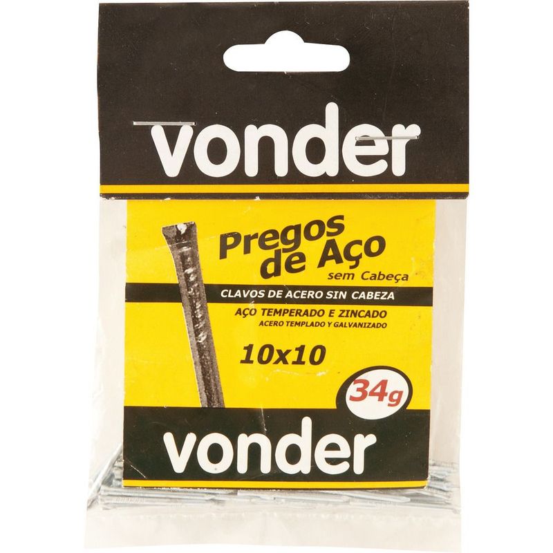 Conteúdo da embalagem100 PregosAplicações e dicas de usoIndicado para fixação em alvenariaDestaques e diferenciaisPossui acabamento zincado, que confere maior resistência à oxidação/corrosão DETALHES TÉCNICOS Material do prego: Aço Acabamento do prego: Zincado Medida JP x LPP: 10 x 10 Comprimento do prego: 23,0 mm Diâmetro do prego: 1,5 mm Tipo do prego: Sem cabeça Peso aproximado: 29 g
