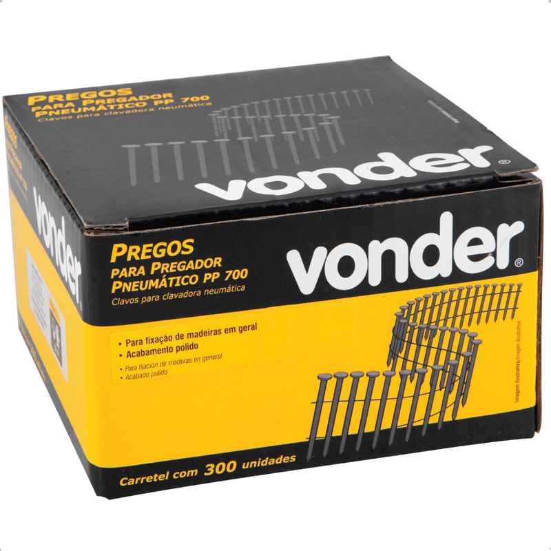 Prego Liso Vonder 70 mm PP700 Polido 300 Peças - Vonder OficialSe você busca agilidade, segurança e acabamento profissional em suas fixações, o Prego Liso Vonder 70 mm PP700 Polido com 300 Peças é o aliado ideal para o seu dia a dia. Desenvolvido especialmente para o uso com o Pregador Pneumático PP 700 da Vonder, esse prego é perfeito para aplicações em madeiras em geral, garantindo uma fixação limpa, rápida e eficaz.Com 2,5 mm de diâmetro e 70 mm de comprimento, esse modelo liso proporciona penetração precisa e segura, sendo indicado para trabalhos que exigem produtividade sem comprometer a qualidade. Seu acabamento polido facilita o deslizamento no interior do pregador pneumático, reduzindo atritos e evitando travamentos — o que se traduz em uma operação contínua, fluida e com menor desgaste das ferramentas.Fabricado em aço carbono, o prego liso Vonder se destaca pela alta resistência mecânica e pela durabilidade. Seja na montagem de estruturas de madeira, pallets, embalagens, forros ou móveis, sua performance é confiável em diferentes tipos de projetos, oferecendo ótima fixação mesmo em madeiras mais densas ou com tratamento.O carretel com 300 unidades oferece excelente rendimento para profissionais que desejam aumentar a produtividade e automatizar seus sistemas de fixação, otimizando o tempo de trabalho sem perder a qualidade nos detalhes. E mesmo sendo projetado para o modelo PP 700 da Vonder, pode ser utilizado em outros pregadores compatíveis com as mesmas especificações, desde que se respeite o diâmetro e o comprimento dos pregos.Além da performance, o Prego Liso Vonder entrega versatilidade no uso e ótimo custo-benefício, sendo ideal para marceneiros, montadores de móveis, profissionais da construção civil e empresas que trabalham com grande volume de fixações em madeira.Especificações- Modelo do pregador: PP 700- Tipo do prego: Liso- Diâmetro do prego: 2,5 mm- Comprimento do prego: 70,0 mm- Material do prego: Aço carbono- Acabamento do prego: Polido- Massa aproximada (peso) (kg): 0,872 kgItens inclusos- Caixa 300 pregosGarantia- 03 meses com o fabricante