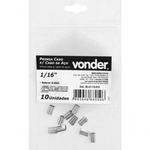 Prensa Cabo Para Cabos De Aço De 1/16'' Com 10 Peças VonderMarca: VonderConteúdo da embalagem: 1 Cartela com 10 peças.Destaques e diferenciais:Fabricado em liga de alumínio (Al 6063), que proporciona excelente resistência à corrosão/oxidação.Dicas de uso:Indicado para confecção de lingas de cabos de aço, substitui os grampos em configurações que dispensam desmontagens. É recomendado o uso de alicate especial para prensagem.Detalhes Técnicos:Material: Al 6063 Diâmetro interno: 1,98 mm Diâmetro do cabo indicado: 1/16 NA