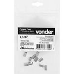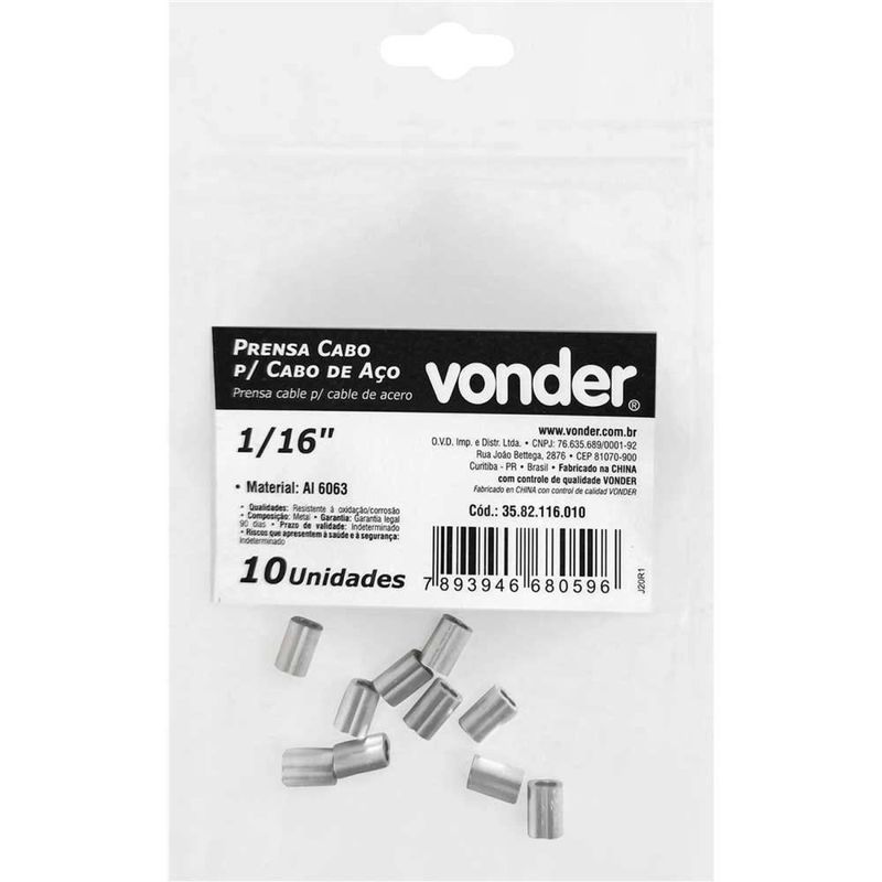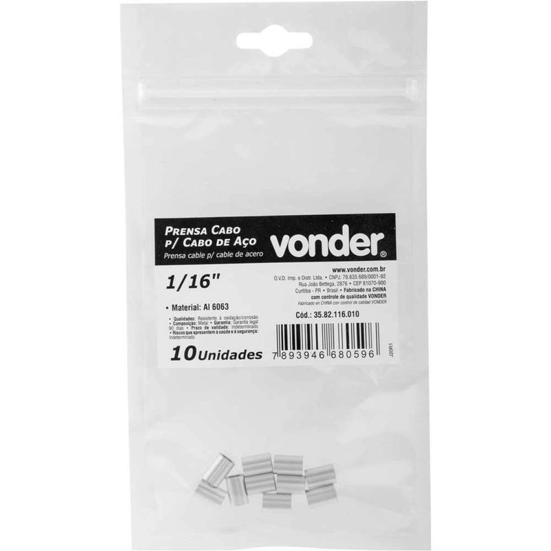 Prensa Cabo Para Cabos de aço de 1/16", Cartela com 10 Peças, Vonder OstenVonder - Conteúdo da embalagem: 1 Cartela com 10 peças. Aplicação: Indicado para confecção de lingas de cabos de aço, substitui os grampos em configurações que dispensam desmontagens. à recomendado o uso de alicate especial para prensagem. Destaques: Fabricado em liga de alumÃnio (Al 6063), que proporciona excelente resistência à corrosão/oxidação. Garantia - E (CDC): Garantia legal: 90 dias Referência: 3582116010 Material: Al 6063 Espessura (D): 1,21 mm Diâmetro do cabo indicado: 1/16" Comprimento (A): 9,5 mm Largura externa (B): 6,4 mm Largura interna (C): 3,9 mm Diâmetro interno: 1,98 mm Massa aproximada (peso): 0.014 kg Destaques Comercial: Fabricado em liga de alumÃnio (Al 6063), que proporciona excelente resistência à corrosão/oxidação. Aplicação Comercial: Usado em lingas de cabos de aço, substitui grampos e requer alicate especial para prensagem. Características Gerais do Produto: Garantia: • 3 Meses