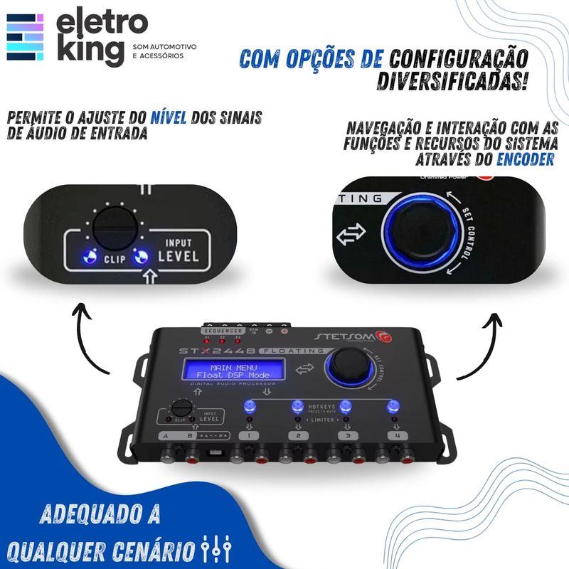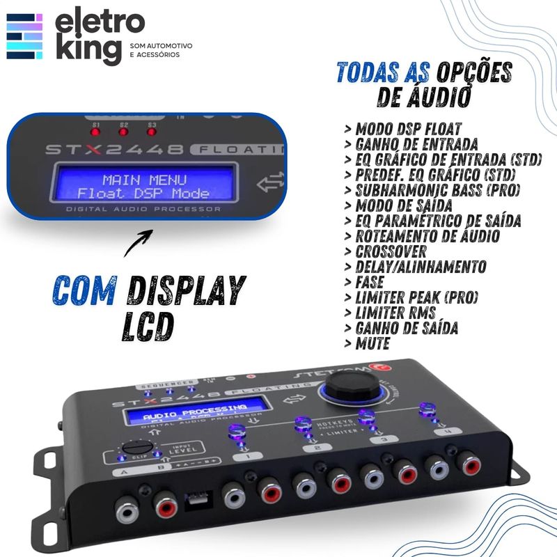 Seja bem-vindo a Eletroking, leia atentamente a descrição do produto abaixo antes da compra, qualquer dúvida, nos acione no campo de perguntas do anúncio. Processador de Audio Digital Stetsom STX2448 Floating - 4 Vias O Processador Stetsom STX2448 Floating eleva a qualidade do áudio automotivo com recursos avançados como equalizadores gráficos e paramétricos, crossover de alta precisão, delay, Sub Harmonic Bass e limiters ajustáveis. Com o exclusivo modo DSP FLOAT, oferece múltiplos fluxos de controle para personalização total. Conta ainda com roteamento inteligente, salvamento automático, senha de segurança e sequenciador remoto. Tudo isso em um design moderno e funcional, pronto para transformar seu sistema de som. Especificações Técnicas: • Quantidade de processadores (DSPs): 1 • Número de Canais de Entrada: 2 • Número de Canais de Saída: 4 • Ganho de Entrada: ±12 dB (IN A / IN B) • Ganho de Saída: LEVEL: 0% ~ 100% & GAIN: -45dB ~ +15dB • Master Level: 0% ~ 100% • Equalizador Gráfico 15 Bandas (Band) • Presets de Equalização Gráfica: 12 presets (gain ±12dB) • Equalizador Paramétrico de Entrada: 1 • Equalizador Paramétrico de Saída: 1 por saída / 1 per audio output • Roteamento: A, B & A+B • Crossover Bessel (dB/8ª): 12/18/24/30/36/42/48 dB/8ª • Crossover Butterworth (dB/8ª): 12/18/24/30/36/42/48 dB/8ª • Crossover Linkwitz-Riley (dB/8ª): 12/18/24/30/36/42/48 dB/8ª • Limite: Limiter PEAK & RMS • Delay 0ms ~ 8ms (275cm) • Display: LCD 16x2 • Resposta em Frequência: 10Hz ~ 22,5KHz @ -1dB • Latência: 1,08ms • Relação Sinal Ruído: >90dB • THD: 80dB • Máxima Tensão de Entrada: RCA IN: 5V RMS / 14,1 Vpp / +16,2 dBu — HIGH IN: 20V RMS / 56,5 Vpp / +28,2 dBu • Máxima Tensão de Saída: 2V RMS / 5,6 Vpp / +8,2 dBu • Tensão de Alimentação 9V ~ 16V DC • Dimensões (A x L x C) mm: 36,5 x 229 x 113,5 mm • Peso Kg: 500g Conteúdo da Embalagem: • Processador de Audio Digital Stetsom STX2448 Floating - 4 Vias • Manual e Certificado de Garantia Importante: • Garantia de 273 Dias. • Valor Unitário. • Todos os Nossos Produtos São Novos, Originais e Acompanham Nota Fiscal. • A Eletroking recomenda que a instalação seja feita por profissional especializado e não se responsabiliza pelo mau uso do produto.