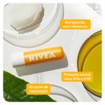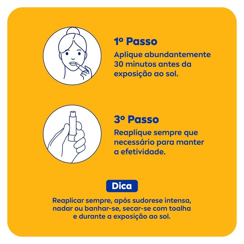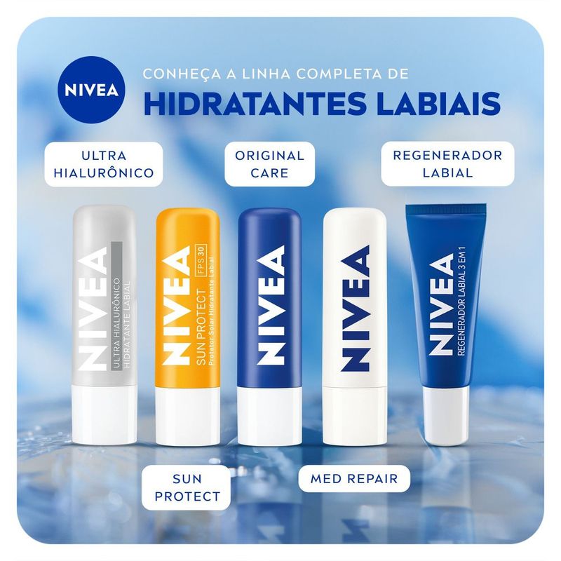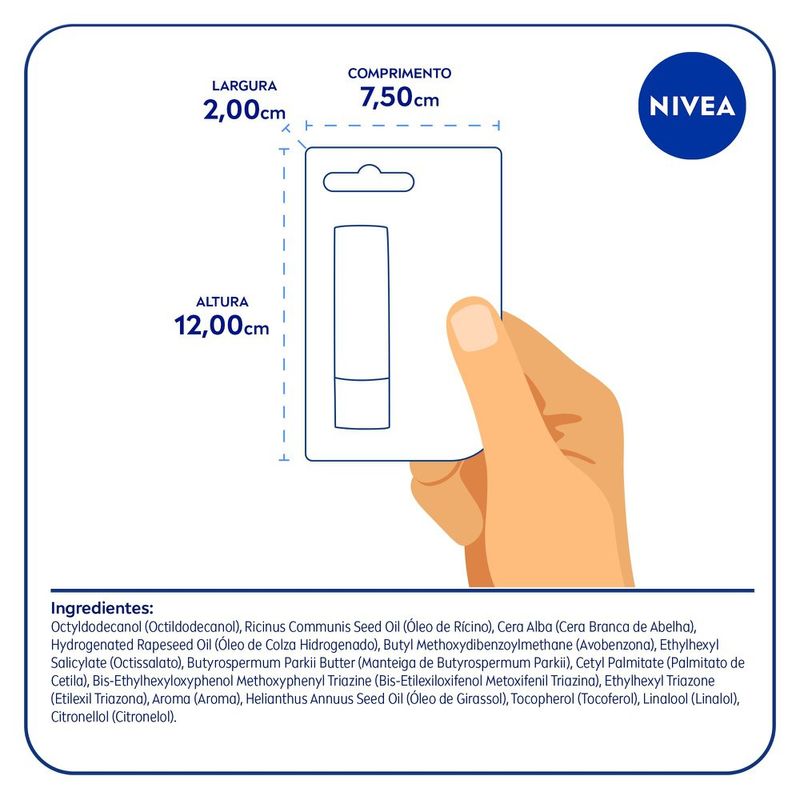 NIVEA Protetor Solar Hidratante Labial Sun Protect FPS 30: Proteção e Hidratação para Seus Lábios O que é? O NIVEA Protetor Solar Hidratante Labial Sun Protect FPS 30 é o aliado ideal para manter seus lábios hidratados e protegidos dos danos solares. Com sua fórmula avançada, oferece proteção eficaz e prolongada, garantindo que seu sorriso esteja sempre saudável e protegido. Para que serve? Este protetor labial com FPS 30 proporciona uma barreira confiável contra os raios UVA e UVB, oferecendo até 24 horas de proteção. Além de hidratar profundamente, ele é formulado com óleos naturais de abacate e jojoba, que nutrem seus lábios e melhoram sua saúde a cada aplicação. Sua aplicação é prática e pode ser feita sem a necessidade de espelho, e sua embalagem reciclável reforça o compromisso com o meio ambiente. Benefícios e diferenciais: Proteção Solar Avançada: Com FPS 30, protege contra os raios UVA e UVB.Ingredientes Naturais: Enriquecido com óleos de abacate e jojoba.Hidratação Intensa: Evita o ressecamento e mantém os lábios macios.Praticidade: Aplicação fácil e uniforme, sem necessidade de espelho.Sustentabilidade: Embalagem reciclável para um impacto ambiental reduzido. Modo de Uso: Aplique o protetor diretamente sobre os lábios.Reaplique sempre que necessário para manter a proteção.Descarte a embalagem corretamente para reciclagem. Ingredientes: Cera Microcristalina, Octyldodecanol, Cetyl Palmitate, Óleo de Semente de Ricinus Communis, Homosalate, Octocrylene, Butyl Methoxydibenzoylmethane, Ethylhexyl Salicylate, Polydecene Hidrogenado, Myristyl Myristate, Cetearyl Alcohol, Bis-Diglyceryl Polyacyladipate-2, C20-40 Alkyl Stearate, Cera de Copernicia Cerifera, Manteiga de Karité, Extrato de Semente de Girassol, Cera Alba, Glucosídeo de Glicerina, Água, Propileno Glicol, Glicerina, Limoneno, Linalool, Álcool Benzílico, Benzoato de Benzila, Citral, Perfume, CI 77891, CI 77492. Precauções: Uso externo. Este produto não substitui a proteção completa contra insolação. Suspenda o uso em caso de irritação e consulte um médico. Armazene em local seco, arejado e fora do alcance de crianças. Mantenha fora da exposição direta ao sol. Dermatologicamente testado.