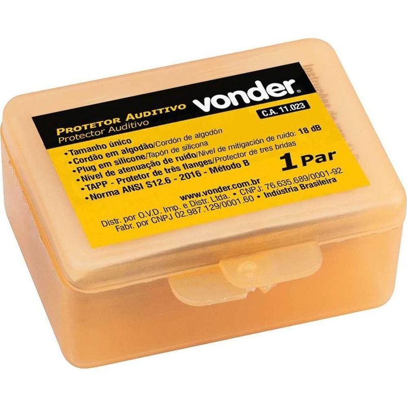 Protetor Auditivo Tipo Plug, De Silicone, Com Cordão Em Algodão, Vonder OstenvonderProtetor Auditivo Tipo Plug, de Silicone, com Cordão em Algodão, Vonder OstenVonder -Conteúdo da embalagem: 1 Par de protetores auditivos.Aplicação: Indicado para proteção do sistema auditivo do usuário contra níveis de pressão sonora superiores ao estabelecido na NR 15, anexos I e II, conforme tabela de atenuação.Destaques: Segue norma técnica ANSI S12.6 - 2016 - Método B.Referência: 7045004000Garantia - E (CDC): Garantia legal: 90 diasCertificados: 11023Massa aproximada (peso): 0,006 kgAtenuação - NRRsf: 18 dBMaterial do cordão: AlgodãoMaterial do plug: Silicone com flangeDestaques Comercial: Segue norma técnica ANSI S12.6 - 2016 - Método B.Aplicação Comercial: Protege o sistema auditivo contra níveis de ruído acima dos limites da NR 15, conforme tabela de atenuação.Características Gerais do Produto:Garantia: - 3 Meses