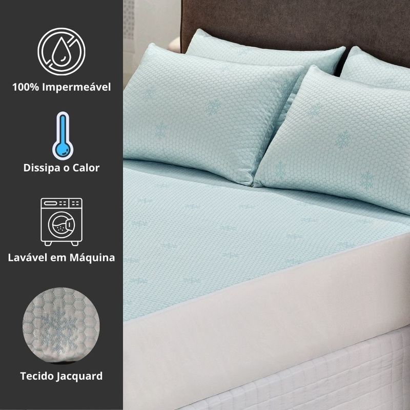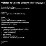 O Protetor de Colchão Freezing da Lynel é um acessório de alta tecnologia projetado para oferecer frescor imediato e proteção total ao seu colchão. Com 3 fatores importantes que se destacam entre os demais:a) Utiliza a inovadora tecnologia de tecido com toque gelado, que dissipa o calor corporal e mantém a superfície da cama em uma temperatura agradável durante toda a noite. Sua estrutura respirável permite a circulação de ar, garantindo uma sensação de frescor contínuo sem abrir mão da proteção impermeável.b) Mantenha seu colchão novo por muito mais tempo. Com uma barreira 100% impermeável, o Protetor Freezing bloqueia líquidos, suor e manchas, prevenindo a formação de mofo e odores. Além disso, sua tecnologia atua contra a proliferação de ácaros e bactérias, sendo a escolha perfeita para quem sofre com alergias respiratórias e busca um ambiente de sono mais limpo e saudável.c) Diferente de protetores comuns, o Freezing é extremamente silencioso, não faz barulho de "plástico" ao se movimentar na cama. Com elástico em toda a borda, ele se ajusta perfeitamente ao colchão como um lençol de baixo, garantindo que a proteção não saia do lugar. Fácil de lavar na máquina, é o investimento ideal para aumentar a durabilidade do seu colchão com o máximo de praticidade.Conteúdo da Embalagem:1 Protetor de Colchão Solteirão Impermeável LynelDimensões:- Largura: 1.10 m- Comprimento: 2.00 m- Altura: 30cm- Indicado para cama SolteirãoTecido e Revestimento:Tecido Superior: 66% Polietileno 34% PoliésterTecido da Saia Lateral: 100% PoliésterVantagens do Produto:Tecido com toque gelado e impermeável;Elástico em toda a volta;Não faz barulho;Prolonga a Vida útil do Colchão;Protege a sua Saúde;Fácil de vestir e lavar;Lavável em Máquina;Permite o fluxo de ar entre o protetor e o Colchão.Fabricante:Lynel