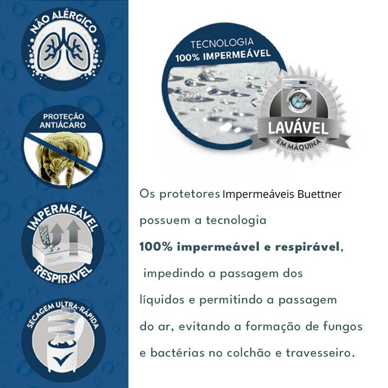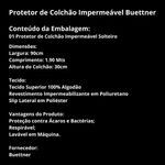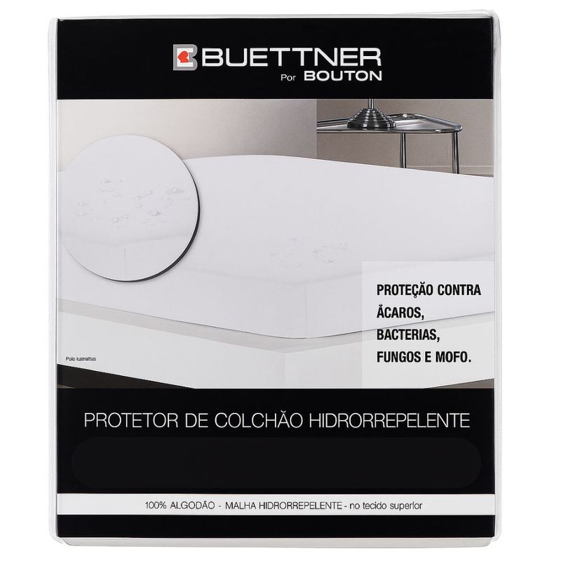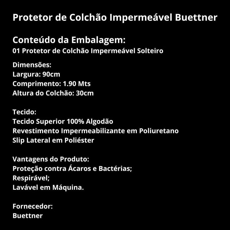 Protetor de Colchão Impermeável Solteiro Buettner – 100% AlgodãoMantenha sua cama sempre limpa e protegida com o Protetor de Colchão Impermeável Buettner. Produzido em tecido 100% algodão, é totalmente impermeável, não alérgico e conta com proteção contra ácaros e bactérias, garantindo mais saúde e conforto para suas noites de sono.Com design prático, veste o colchão como um lençol de elástico, facilitando a colocação e a remoção. Além disso, pode ser lavado na máquina, unindo praticidade e durabilidade.Características:Material: 100% algodãoTotalmente impermeávelProteção contra ácaros e bactériasNão alérgicoFácil de vestir (modelo com elástico)Lavável em máquinaDimensões:Largura: 90 cmComprimento: 1,90 mAltura do colchão: até 30 cmConteúdo da embalagem:01 Protetor de Colchão Impermeável SolteiroFornecedor: Buettner
