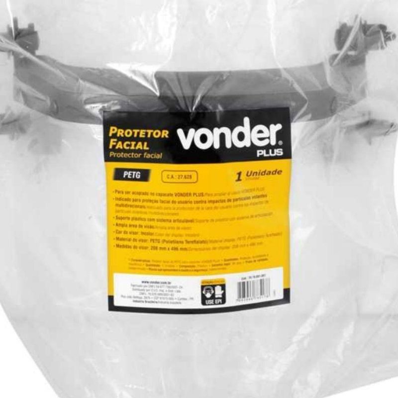 Protetor Facial Petg Para Capacete Vonder PlusProtetor Facial PETG para Capacete Vonder Plus: Segurança e Conforto em um Só Produto!O Protetor Facial PETG para Capacete Vonder Plus é a escolha ideal para quem busca proteção e durabilidade. Fabricado em PETG (Polietileno Tereftalato), este protetor oferece resistência superior e uma ampla área de visão, garantindo segurança contra impactos de partículas volantes multidirecionais. Com um suporte plástico articulável, ele é fácil de instalar e ajustar, proporcionando conforto e praticidade no uso diário.Este protetor é especialmente projetado para ser acoplado ao capacete VONDER PLUS, mas também pode ser compatível com outros modelos de capacetes Vonder. Verifique a compatibilidade com seu capacete para garantir o encaixe perfeito. Além disso, o material PETG é conhecido por sua resistência a impactos e durabilidade, tornando-o uma excelente escolha para quem precisa de proteção confiável.**ESPECIFICAÇÕES TÉCNICAS:**- Marca: Vonder- Modelo: 7078801001- Material do visor: PETG (Polietileno Tereftalato)- Medidas do visor: 208 mm x 496 mm- Massa aproximada (peso): 0,21 kg- Cor do visor: Incolor- Certificado de aprovação (CA): 27628- É ajustável: Sim- Com arnês: Sim- Acessórios incluídos: Viseiras- Usos recomendados: Segurança**FUNÇÕES E CARACTERÍSTICAS:**- Proteção facial incolor para capacetes- Material PETG resistente- Suporte plástico com sistema articulável- Ampla área de visão**INSTRUÇÕES DE USO:**1. Verifique a compatibilidade do protetor com seu capacete.2. Acople o protetor ao capacete, ajustando o suporte plástico articulável.3. Certifique-se de que o protetor está firmemente fixado antes de usar.4. Para manutenção, limpe o protetor regularmente com um pano macio e evite o uso de produtos químicos abrasivos.**ITENS INCLUSOS:**- 1 Protetor facial para capacete NA