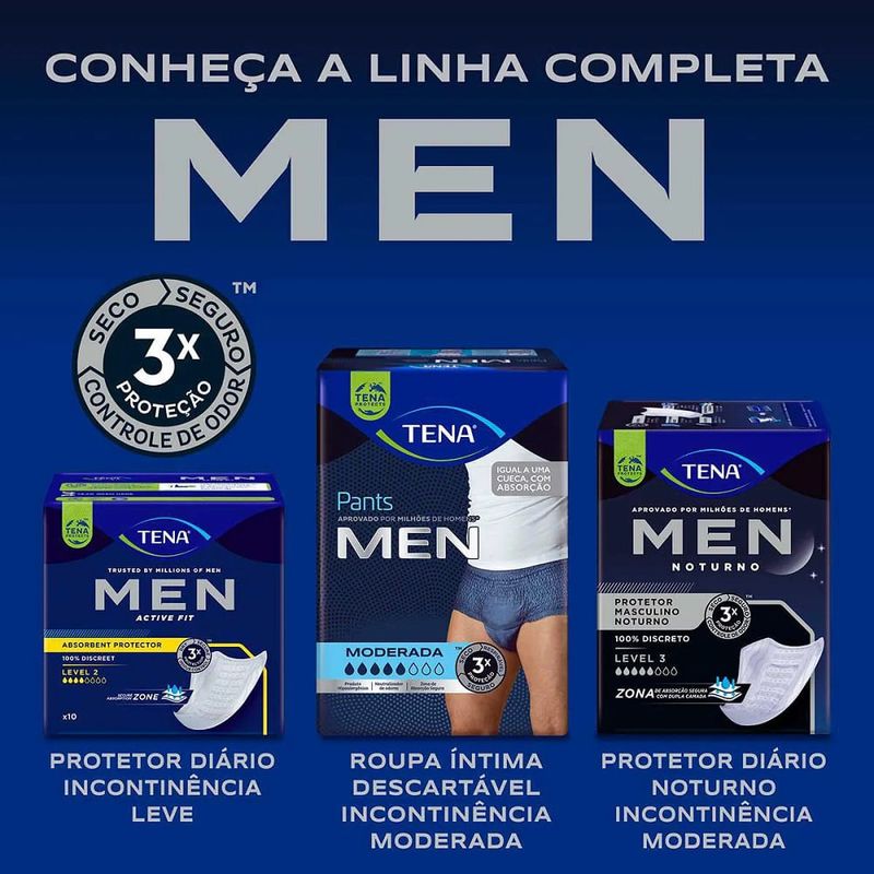 O que é e para que serve o Protetor Masculino Noturno Tena Men? O Protetor Masculino Noturno Tena Men é um absorvente descartável desenvolvido especialmente para homens que sofrem com perdas urinárias moderadas. Este protetor foi projetado para se ajustar perfeitamente ao corpo masculino, oferecendo um formato confortável e discreto, com embalagens individuais para maior praticidade. Com a tecnologia Secure Absorption, o Tena Men Noturno oferece uma absorção eficiente e segura para homens com incontinência urinária moderada: Núcleo superabsorvente: garante a retenção eficaz da urina.Controle de odores: minimiza e elimina odores indesejáveis. Benefícios e diferenciais: Segurança e conforto durante toda a noite.Proteção confiável contra incontinência urinária moderada.Fácil fixação na roupa íntima masculina.Absorve gotejamentos e escapes contínuos de urina.Alto controle contra vazamentos.Previne odores e mantém a região íntima seca.Design discreto e confortável. Como usar o Protetor Masculino Noturno Tena Men Nível 3? Para aplicar, retire a fita adesiva na parte de trás e fixe o protetor no centro da cueca, pressionando para garantir que esteja bem ajustado. Composição:O protetor é composto por fibras de celulose, polipropileno, polietileno, gel superabsorvente, poliacrilato de sódio e adesivos termoplásticos. Alerta:Em casos de incontinência urinária severa, substitua o absorvente a cada 3 horas e utilize-o com uma calça plástica. Sempre consulte um urologista. Advertências: Produto de uso único e individual.Descarte o absorvente em lixeiras apropriadas, nunca no vaso sanitário.Se ocorrer irritação na pele, suspenda o uso e consulte um médico.Armazene em local fresco e seco, protegido da luz.Mantenha fora do alcance de crianças.