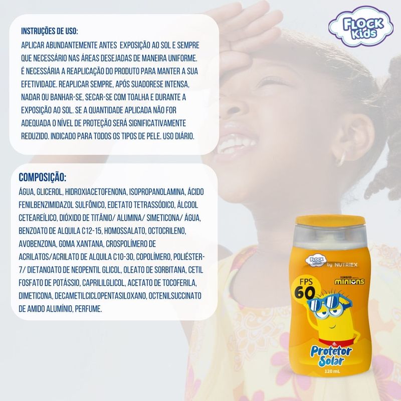 Protetor Solar Flock Kids Minions Fps60 120ml O Protetor Solar Flock Kids Minions FPS 60 foi especialmente desenvolvido para a pele sensível das crianças, oferecendo alta proteção solar contra os raios UVA e UVB com uma fórmula segura, hipoalergênica e dermatologicamente testada. Sua textura leve, não oleosa e de rápida absorção evita o toque pegajoso e não deixa resíduos brancos, garantindo uma experiência agradável para pais e crianças. Enriquecido com ativos hidratantes, ajuda a manter a pele protegida, hidratada e confortável mesmo após longos períodos de exposição ao sol. O que é? É um protetor solar infantil FPS 60, formulado para oferecer proteção solar alta e segura para crianças, indicado para uso diário e atividades ao ar livre. Para que serve? Serve para proteger a pele infantil contra os danos causados pela radiação solar, prevenindo queimaduras solares e contribuindo para o cuidado da pele sensível desde cedo, com segurança dermatológica. Benefícios e diferenciais FPS 60 com alta proteção UVA e UVB Fórmula hipoalergênica, ideal para peles sensíveis Livre de parabenos e corantes Dermatologicamente testado Resistente à água e ao suor Textura leve, não oleosa e de rápida absorção Não deixa resíduos brancos Embalagem divertida dos Minions, que estimula o uso correto Modo de uso Aplique uma quantidade generosa do Protetor Solar Flock Kids FPS 60 Minions sobre a pele seca antes da exposição ao sol. Reaplique sempre após nadar, suar excessivamente ou se secar com toalha, garantindo proteção solar contínua e eficaz. Segurança e cuidados Uso externo. Evitar contato com os olhos. Em caso de contato, enxaguar abundantemente. Não aplicar sobre a pele irritada ou lesionada. Suspender o uso em caso de irritação. Manter fora do alcance de crianças. Conservar em local fresco, seco e ao abrigo da luz.