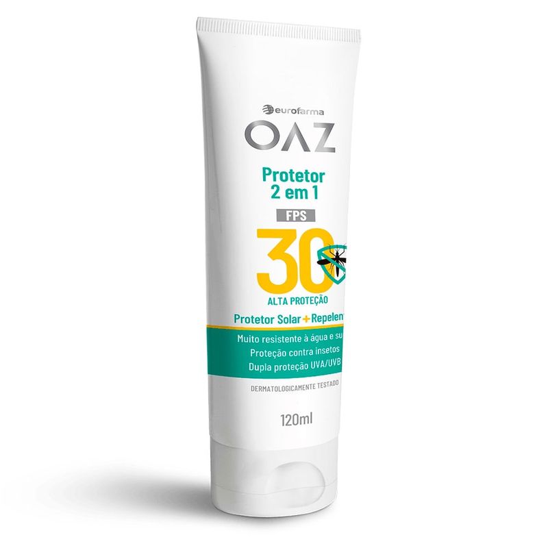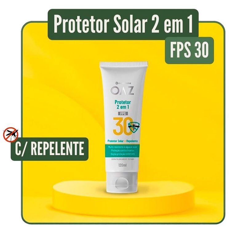 Protetor Solar + Repelente 2 em 1 OAZ Fps30 120ml O que é e para que serve? O Protetor Solar + Repelente 2 em 1 OAZ FPS 30 foi desenvolvido para oferecer dupla proteção essencial ao ar livre: ele protege a pele contra os efeitos nocivos dos raios UVA/UVB e ainda afasta os insetos transmissores de doenças como Dengue, Zika, Chikungunya e Malária. Sua fórmula contém 10% de DEET, garantindo até 3 horas de repelência eficaz. Além disso, é resistente à água e ao suor, ideal para atividades externas, viagens, praia, piscina e esportes ao ar livre. Possui textura leve, rápida absorção e fragrância suave, indicada para todos os tipos de pele. Benefícios Proteção solar com FPS 30 contra raios UVA/UVB. Repelência eficaz contra mosquitos transmissores de doenças. Resistente à água e ao suor, perfeito para dias de calor intenso. Textura leve, fragrância suave e agradável. Dupla função: economia e praticidade em um único produto. Como usar corretamente? Agite antes de usar. Aplique generosamente sobre a pele limpa e seca antes da exposição ao sol. Reaplique sempre após sudorese intensa, banho de mar/piscina ou secagem com toalha. Para manter a eficácia, reaplique o produto durante a exposição solar e sempre que necessário. Atenção: Não aplique no rosto, mucosas, olhos ou sob roupas. Indicação de uso Adultos e crianças a partir de 2 anos (com supervisão de um adulto). Ideal para atividades ao ar livre, viagens, praias, piscinas, trilhas e esportes. Pode ser usado em todos os tipos de pele. Precauções importantes Não usar em crianças menores de 2 anos. De 2 a 12 anos, aplicar no máximo 3 vezes ao dia. Em caso de irritação, suspender o uso e procurar orientação médica. Durante a gravidez e amamentação, consulte um médico antes de utilizar. Lave sempre as mãos após a aplicação. Composição Ativa Filtros solares (Avobenzona, Octissalato, Homossalato, Octocrileno, Ensulizole) – proteção contra os raios UVA/UVB. DEET 10% (Dietiltoluamida) – repelente eficaz contra mosquitos transmissores de doenças. Óleo de Girassol e Glicerol – auxiliam na hidratação e cuidado com a pele. Conteúdo da Embalagem 1 frasco de Protetor Solar + Repelente 2 em 1 OAZ FPS 30 – 120ml