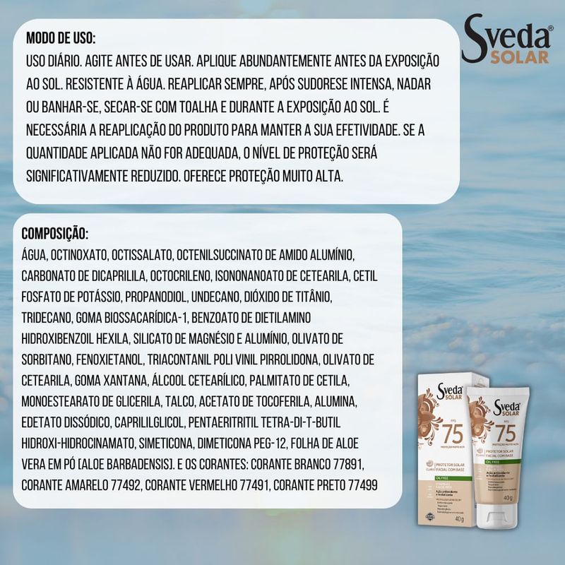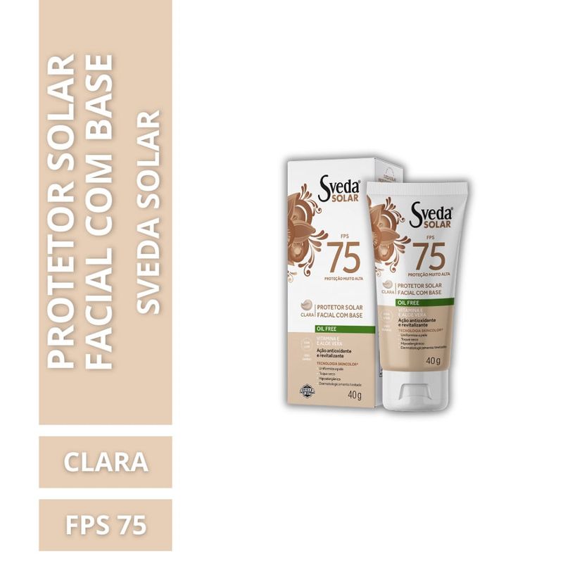 Protetor Solar Sveda Base Clara Fps75 40g O Protetor Solar Facial Sveda FPS 75 garante alta proteção UVA/UVB, prevenindo queimaduras solares e o envelhecimento precoce. Sua Tecnologia SkinColor adapta-se ao tom da pele, proporcionando cobertura uniforme e acabamento natural. A versão Base Clara é ideal para peles mais claras, garantindo proteção e um visual harmonioso. Proteção Muito Alta : 75 vezes mais proteção contra UVB e mínimo de 1/3 de proteção UVA. Filtros Químicos e Físicos : Absorvem e refletem os raios UV, protegendo a pele de forma eficaz. Formulação Oil-Free : Textura leve e rápida absorção, sem obstruir os poros. Acabamento Mate : Controle do brilho e toque seco para conforto prolongado. Com Vitamina E e Aloe Vera : Ação antioxidante, hidratante e calmante para a pele. Dermatologicamente testado | Hipoalergênico | 100% Vegano Compre online na Farmácia Indiana!