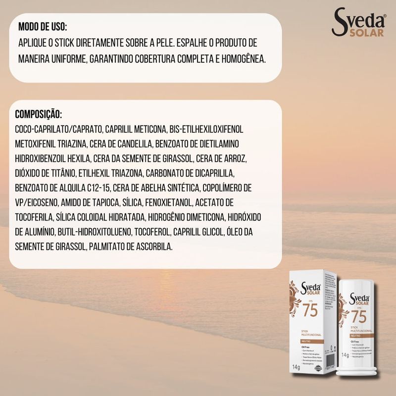 Protetor Solar Sveda Stick Multifuncional Neutro Fps75 14g Para que serve o Protetor Solar Sveda Stick Multifuncional Neutro FPS 75? O Protetor Solar Sveda Stick Multifuncional FPS 75 é a solução ideal para quem busca praticidade e eficácia na proteção solar. Com FPS 75 e FPUVA 26, ele oferece proteção contra os danos causados pela radiação solar, prevenindo o fotoenvelhecimento e o aparecimento de manchas. Sua fórmula oil-free e com efeito matte controla a oleosidade da pele, mantendo-a fresca e sem brilho. Enriquecido com Vitamina E, um poderoso antioxidante, o produto também ajuda a combater os radicais livres e a promover uma pele saudável e revitalizada. Como usar o Protetor Solar Sveda Stick Multifuncional Neutro FPS 75? Aplique diretamente o bastão sobre a pele, espalhando o produto de maneira uniforme para garantir cobertura completa e homogênea. Utilize antes da exposição ao sol e reaplique após sudorese intensa ou após nadar para manter a eficácia do produto. Composição Coco-Caprilato/Caprato, Caprilil Meticona, Bis-Etilhexiloxifenol Metoxifenil Triazina, Cera de Candelila, Benzoato de Dietilamino Hidroxibenzoil Hexila, Cera da Semente de Girassol, Cera de Arroz, Dióxido de Titânio, Etilhexil Triazona, Carbonato de Dicaprilila, Benzoato de Alquila C12-15, Cera de Abelha Sintética, Copolímero de VP/Eicoseno, Amido de Tapioca, Sílica, Fenoxietanol, Acetato de Tocoferila, Sílica Coloidal Hidratada, Hidrogênio Dimeticona, Hidróxido de Alumínio, Butil-Hidroxitolueno, Tocoferol, Caprilil Glicol, Óleo da Semente de Girassol, Palmitato de Ascorbila. Advertências Uso externo. Não ingerir. Evite o contato com os olhos; em caso de contato, lave com água em abundância. Suspenda o uso em caso de segurança e consulte um médico. Mantenha o produto em local fresco e fora do alcance de crianças. Não exporte o produto diretamente ao sol. Este produto foi formulado para minimizar o risco de alergias. Principais Benefícios Proteção solar FPS 75 e FPUVA 26 Fórmula oil-free e toque seco Efeito matte, ideal para peles oleosas Combate o fotoenvelhecimento e previne manchas solares Contém Vitamina E, um poderoso antioxidante Prático e fácil de aplicar, ideal para o uso diário Dermatologicamente testado e hipoalergênico