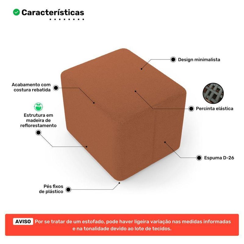 Puff Decorativo Living Yumi Retangular 60cm Bouclê Terracota - AbmazaTransforme qualquer ambiente em um espaço acolhedor e elegante com o Puff Retangular Yumi. Feito com estrutura de madeira de reflorestamento, ele alia sustentabilidade à durabilidade. O conforto é garantido pela espuma D-26 e o suporte adicional das percintas elásticas, enquanto os cantos levemente curvados adicionam um toque de sofisticação. Além disso, as sapatas plásticas protegem o seu piso, proporcionando praticidade no dia a dia. Seja no living, sala de estar, recepção ou quarto, o Puff Yumi é a escolha ideal para agregar conforto e estilo.Adquira agora e transforme o seu espaço com um toque de aconchego que faz toda a diferença!Dimensões do Puff:Largura: 60 cmAltura: 45 cmProfundidade: 50 cmAltura dos Pés: 2 cmPeso Aproximado: 8 kgATENÇÃO:** PODE HAVER UMA PEQUENA VARIAÇÃO DE COR ENTRE O PRODUTO REAL E A IMAGEM ANUNCIADA DEVIDO AO LOTE DE TECIDOS.** POR SE TRATAR DE UM ESTOFADO ARTESANAL, AS MEDIDAS PODEM APRESENTAR UMA LIGEIRA VARIAÇÃO DE ATÉ 3 CM.Características:Material da Estrutura: Madeira de EucaliptoMaterial do Estofamento: Espuma D-26Revestimento: BouclêPossui Pés: SimTipo de Pés: SapatasMaterial dos Pés: PlásticoQuantidades de Lugares: 1Peso Suportado: 100 kg sem ImpactoAmbiente Principal: Sala de Estar, Recepção, Living, Salão de Beleza, Quarto, Salão de FestaTipo de Produto: Puff Minimalista, Puff Retangular, Banco Estofado, Puff Eco-friendlyPossui Manual de Montagem: NãoDiferenciais:- Espuma D-26- Com Percintas Elásticas- Acabamento com Costura Rebatida- Matéria Prima de ReflorestamentoItens Inclusos:- 01 Puff.Montagem:- Complexidade da Montagem: Baixa.- Recomendamos que seja feita por um qualificado.- Produto enviado montado.Garantia de :90 dias contra de fabricação.Limpeza e cuidados: Utilizar pano levemente umedecido com água, seguido de pano seco. Não utilizar produtos químicos ou abrasivos na limpeza. Evitar com objetos cortantes. Manter ao abrigo de interno, sem ficar exposto diretamente ao sol, calor e umidade excessivo.Importante:- Pode haver ligeira diferença de tonalidade entre a imagem digital e o produto real por conta do tratamento de imagens e a calibração de cores do seu monitor.- As imagens são meramente ilustrativas, não acompanham objetos de decoração e eletrônicos.- Produto para uso residencial em ambiente interno, não devendo ficar exposto diretamente ao sol, calor e umidades excessivas.- Ao receber a mercadoria verifique a condição da embalagem, caso apresente violação ou esteja danificada não assine o de .- Montagem, desmontagem e outras instalações é de inteira responsabilidade do cliente.- Caso resida em apartamento ou condomínio é indispensável que confira as dimensões do produto e certifique-se de que passará normalmente por elevadores, portas, escadas e/ou corredores de sua residência. Não nos responsabilizamos no ato da , por subir escadas/elevadores ou pelo por guincho em apartamentos. Eventuais despesas são de responsabilidade do comprador.