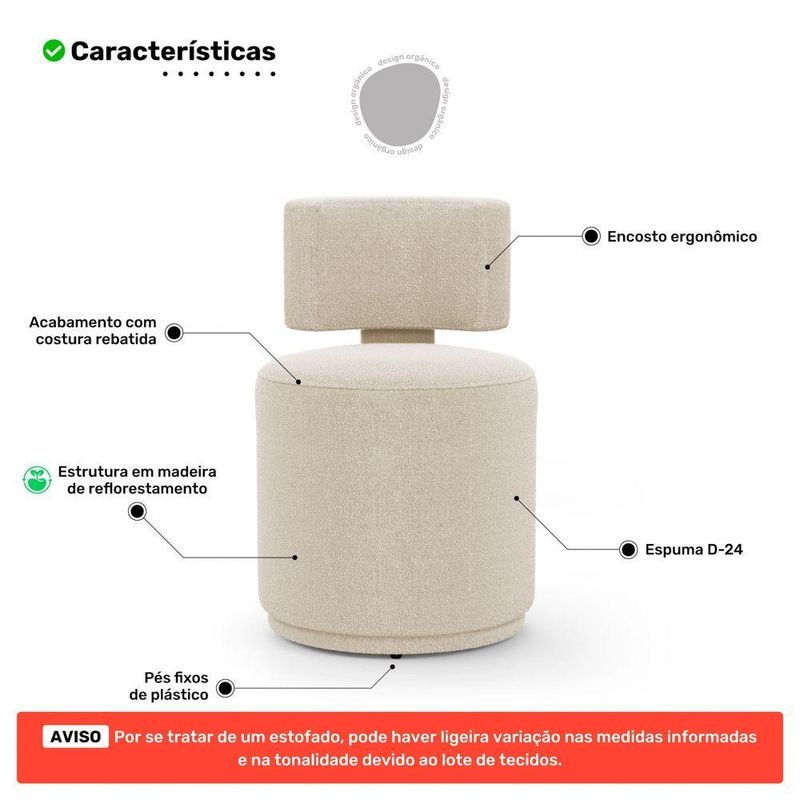 Puff Decorativo Orgânico Living Melis Minimalista Bouclê Bege - AbmazaQue tal o Puff Decorativo Living Melis Orgânico?Buscando uma peça versátil e moderna para completar sua decoração? O Puff Decorativo Living Melis é a escolha perfeita! Com um design orgânico e minimalista, ele se adapta com elegância a diversos ambientes, como sala de estar, living e até espaços corporativos. Sua estrutura é fabricada em Madeira de Eucalipto, garantindo durabilidade e resistência. A espuma de densidade D-24 oferece um conforto incomparável, enquanto seu encosto curvo e base revestida proporcionam um toque sofisticado. Os pés de plástico garantem estabilidade sem comprometer o visual moderno.Com formato cilíndrico e compacto, este puff decorativo é perfeito para quem deseja otimizar espaços sem abrir mão do estilo. Além disso, o Puff Living Melis está alinhado às principais tendências de decoração, como a decoração orgânica, que valoriza formas naturais e o uso consciente de materiais.Ideal para momentos de descontração ou para complementar a estética do ambiente, o Puff Melis vai transformar sua casa em um espaço ainda mais acolhedor e cheio de personalidade.Adquira agora e eleve o estilo da sua decoração com um toque contemporâneo e funcional!Dimensões do Puff:Largura: 46 cmAltura Total: 70 cmProfundidade: 48 cmAltura até o Assento: 46 cmAltura do Encosto: 22 cmLargura do Encosto: 35 cmAltura dos Pés: 2 cmPeso Aproximado: 10 kgATENÇÃO:** PODE HAVER UMA PEQUENA VARIAÇÃO DE COR ENTRE O PRODUTO REAL E A IMAGEM ANUNCIADA DEVIDO AO LOTE DE TECIDOS.** POR SE TRATAR DE UM ESTOFADO ARTESANAL, AS MEDIDAS PODEM APRESENTAR UMA LIGEIRA VARIAÇÃO DE ATÉ 3 CM.Características:Material da Estrutura: Madeira de EucaliptoMaterial do Estofamento: Espuma D-24Revestimento: BouclêPossui Pés: SimTipo de Pés: SapatasMaterial dos Pés: PlásticoQuantidades de Lugares: 1Peso Suportado: 100 kg sem ImpactoAmbiente Principal: Sala de Estar, Recepção, Living, Salão de Beleza, Quarto, Salão de FestaTipo de Produto: Puff Minimalista, Puff Redondo, Banco Estofado, Puff Eco-friendlyPossui Manual de Montagem: NãoDiferenciais:- Espuma D-24- Compacto- Design Orgânico- Matéria Prima de ReflorestamentoItens Inclusos:- 01 Puff.Montagem:- Complexidade da Montagem: Baixa.- Recomendamos que seja feita por um qualificado.- Produto enviado montado.Garantia de :90 dias contra de fabricação.Limpeza e cuidados: Utilizar pano levemente umedecido com água, seguido de pano seco. Não utilizar produtos químicos ou abrasivos na limpeza. Evitar com objetos cortantes. Manter ao abrigo de interno, sem ficar exposto diretamente ao sol, calor e umidade excessivo.Importante:- Pode haver ligeira diferença de tonalidade entre a imagem digital e o produto real por conta do tratamento de imagens e a calibração de cores do seu monitor.- As imagens são meramente ilustrativas, não acompanham objetos de decoração e eletrônicos.- Produto para uso residencial em ambiente interno, não devendo ficar exposto diretamente ao sol, calor e umidades excessivas.- Ao receber a mercadoria verifique a condição da embalagem, caso apresente violação ou esteja danificada não assine o de .- Montagem, desmontagem e outras instalações é de inteira responsabilidade do cliente.- Caso resida em apartamento ou condomínio é indispensável que confira as dimensões do produto e certifique-se de que passará normalmente por elevadores, portas, escadas e/ou corredores de sua residência. Não nos responsabilizamos no ato da , por subir escadas/elevadores ou pelo por guincho em apartamentos. Eventuais despesas são de responsabilidade do comprador.