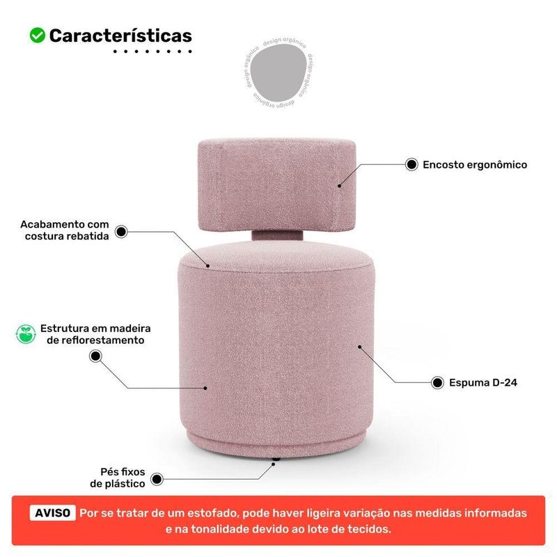 Puff Decorativo Orgânico Living Melis Minimalista Bouclê Rosê - AbmazaQue tal o Puff Decorativo Living Melis Orgânico?Buscando uma peça versátil e moderna para completar sua decoração? O Puff Decorativo Living Melis é a escolha perfeita! Com um design orgânico e minimalista, ele se adapta com elegância a diversos ambientes, como sala de estar, living e até espaços corporativos. Sua estrutura é fabricada em Madeira de Eucalipto, garantindo durabilidade e resistência. A espuma de densidade D-24 oferece um conforto incomparável, enquanto seu encosto curvo e base revestida proporcionam um toque sofisticado. Os pés de plástico garantem estabilidade sem comprometer o visual moderno.Com formato cilíndrico e compacto, este puff decorativo é perfeito para quem deseja otimizar espaços sem abrir mão do estilo. Além disso, o Puff Living Melis está alinhado às principais tendências de decoração, como a decoração orgânica, que valoriza formas naturais e o uso consciente de materiais.Ideal para momentos de descontração ou para complementar a estética do ambiente, o Puff Melis vai transformar sua casa em um espaço ainda mais acolhedor e cheio de personalidade.Adquira agora e eleve o estilo da sua decoração com um toque contemporâneo e funcional!Dimensões do Puff:Largura: 46 cmAltura Total: 70 cmProfundidade: 48 cmAltura até o Assento: 46 cmAltura do Encosto: 22 cmLargura do Encosto: 35 cmAltura dos Pés: 2 cmPeso Aproximado: 10 kgATENÇÃO:** PODE HAVER UMA PEQUENA VARIAÇÃO DE COR ENTRE O PRODUTO REAL E A IMAGEM ANUNCIADA DEVIDO AO LOTE DE TECIDOS.** POR SE TRATAR DE UM ESTOFADO ARTESANAL, AS MEDIDAS PODEM APRESENTAR UMA LIGEIRA VARIAÇÃO DE ATÉ 3 CM.Características:Material da Estrutura: Madeira de EucaliptoMaterial do Estofamento: Espuma D-24Revestimento: BouclêPossui Pés: SimTipo de Pés: SapatasMaterial dos Pés: PlásticoQuantidades de Lugares: 1Peso Suportado: 100 kg sem ImpactoAmbiente Principal: Sala de Estar, Recepção, Living, Salão de Beleza, Quarto, Salão de FestaTipo de Produto: Puff Minimalista, Puff Redondo, Banco Estofado, Puff Eco-friendlyPossui Manual de Montagem: NãoDiferenciais:- Espuma D-24- Compacto- Design Orgânico- Matéria Prima de ReflorestamentoItens Inclusos:- 01 Puff.Montagem:- Complexidade da Montagem: Baixa.- Recomendamos que seja feita por um qualificado.- Produto enviado montado.Garantia de :90 dias contra de fabricação.Limpeza e cuidados: Utilizar pano levemente umedecido com água, seguido de pano seco. Não utilizar produtos químicos ou abrasivos na limpeza. Evitar com objetos cortantes. Manter ao abrigo de interno, sem ficar exposto diretamente ao sol, calor e umidade excessivo.Importante:- Pode haver ligeira diferença de tonalidade entre a imagem digital e o produto real por conta do tratamento de imagens e a calibração de cores do seu monitor.- As imagens são meramente ilustrativas, não acompanham objetos de decoração e eletrônicos.- Produto para uso residencial em ambiente interno, não devendo ficar exposto diretamente ao sol, calor e umidades excessivas.- Ao receber a mercadoria verifique a condição da embalagem, caso apresente violação ou esteja danificada não assine o de .- Montagem, desmontagem e outras instalações é de inteira responsabilidade do cliente.- Caso resida em apartamento ou condomínio é indispensável que confira as dimensões do produto e certifique-se de que passará normalmente por elevadores, portas, escadas e/ou corredores de sua residência. Não nos responsabilizamos no ato da , por subir escadas/elevadores ou pelo por guincho em apartamentos. Eventuais despesas são de responsabilidade do comprador.