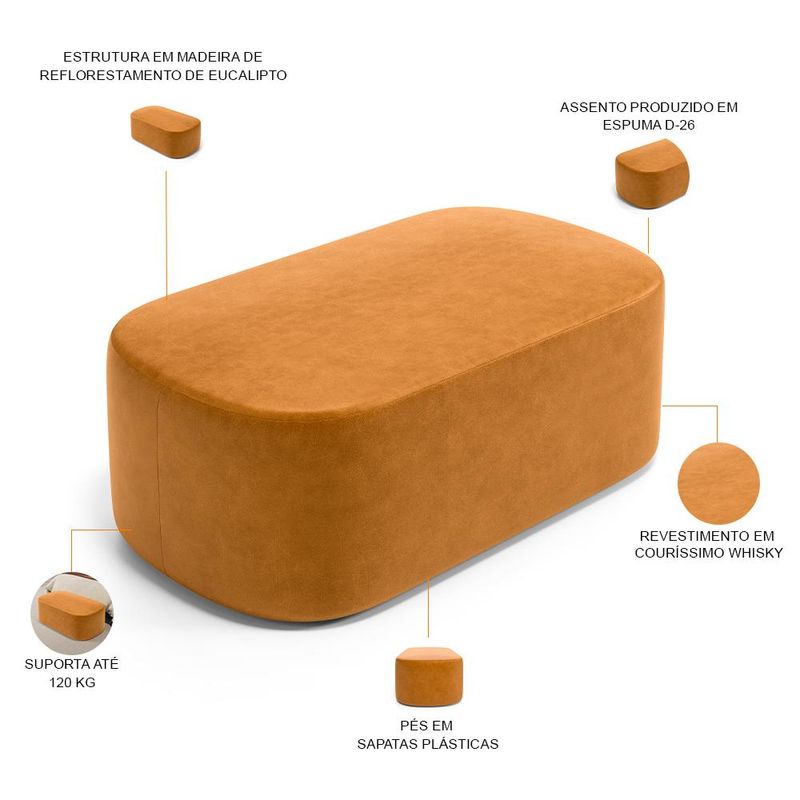 Com um design minimalista, o Puff Decorativo Doha, da Lyam Decor, é sinônimo de modernidade e versatilidade. Com cantos curvos e fluidos, esse puff retangular além de dar um toque de contemporaneidade à decoração, ainda pode ser aproveitado de diversas formas, desde assento extra para a sala de estar à recamier para o quarto, ou ainda como divisor de ambientes para living e outros espaços. Em outras palavras, esse puff orgânico é o complemento perfeito, já que harmoniza facilmente com vários estilos e ambientes, sem contar que oferece conforto e bem-estar. Então, não perca mais tempo e transforme a sua casa com esse puff que transborda beleza e suavidade na medida certa. Adicione agora mesmo ao sei carrinho! Dimensões da Poltrona (L x A x P) 100 x 42 x 60 cm Características: Estrutura em madeira de reflorestamento de eucalipto. Revestimento em Couríssimo na cor Whisky de alta qualidade. Assento com espuma D-26. Peso suportado: Até 120 kg. Pés em sapatas plásticas. - Por se tratar de estofado as medidas podem ter uma pequena variação de até 3 cm. - A tonalidade do produto real poderá ter ligeira variação devido o lote de tecidos. Observações importantes: - Produto para uso residencial em ambiente interno, não devendo ficar exposto diretamente ao sol, calor e umidade excessivos. - Pode haver alguma diferença de tonalidade entre a imagem e o produto real, por conta do tratamento de imagens e a calibração de cores do seu monitor. - As imagens são meramente ilustrativas, não acompanham objetos de decoração e eletrônicos. - Ao receber a mercadoria, o cliente deve verificar as condições da embalagem, caso haja alguma avaria não assine o comprovante de recebimento e entre em contato com nossa loja para orientações. - Montagem, desmontagem e outras instalações serão de responsabilidade do cliente. Não nos responsabilizamos, no ato da entrega, por subir escadas/elevadores ou pelo transporte por guincho em apartamentos. Eventuais despesas são de responsabilidade do comprador. - Confira as dimensões do produto e certifique-se de que passará normalmente por supostos elevadores, portas, escadas e/ou corredores de sua residência. - Para mais informações, acesse nossa Central de Atendimento.