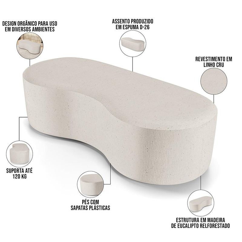 Seguindo a tendência que tem ganhado o coração e a casa de muitas é pessoas, o Puff Decorativo Orgânico para Living Quarto 140cm Orbit , da Lyam Decor, expressa com grande o estilo orgânico, que tem como proposta agregar leveza e fluidez aos mais diversos espaços. Por isso, ao apostar nesse puff feijão você não terá apenas um ambiente com design moderno, e visualmente impactante, como também vai criar a sensação de harmonia e acolhimento. Seja para compor a decoração da sala de estar, living, quarto, escritório e até mesmo ambientes comerciais e industriais, esse puff orgânico é tão versátil quanto a vida precisa ser. Por isso, se você quer um ambiente sofisticado e clean, adicione o Puff Orbit ao seu carrinho e surpreenda-se! Dimensões do Puff (L x A x P) 140 x 42 x 66 cm Profundidade da parte menor: 59 cm Características: Estrutura em madeira de reflorestamento de eucalipto. Revestimento em tecido Linho de alta qualidade na cor Cru. Assento com espuma D-26 de alta resistência. Design orgânico para uso em diversos ambientes. Pés sapatas plásticas. Peso suportado: Até 120 kg. - Por se tratar de estofado as medidas podem ter uma pequena variação de até 3 cm. - A tonalidade do produto real poderá ter ligeira variação devido o lote de tecidos. - Indicado para uso residencial, sua limpeza deve ser feita com pano levemente umedecido em água limpa, sem esfregar, não utilizar produtos abrasivos, desengordurantes, álcool ou solvente. Observações importantes: - Produto para uso residencial em ambiente interno, não devendo ficar exposto diretamente ao sol, calor e umidade excessivos. - Pode haver alguma diferença de tonalidade entre a imagem e o produto real, por conta do tratamento de imagens e a calibração de cores do seu monitor. - As imagens são meramente ilustrativas, não acompanham objetos de decoração e eletrônicos. - Ao receber a mercadoria, o cliente deve verificar as condições da embalagem, caso haja alguma avaria não assine o comprovante de recebimento e entre em contato com nossa loja para orientações. - Montagem, desmontagem e outras instalações serão de responsabilidade do cliente. Não nos responsabilizamos, no ato da entrega, por subir escadas/elevadores ou pelo transporte por guincho em apartamentos. Eventuais despesas são de responsabilidade do comprador. - Confira as dimensões do produto e certifique-se de que passará normalmente por supostos elevadores, portas, escadas e/ou corredores de sua residência. - Para mais informações, acesse nossa Central de Atendimento.