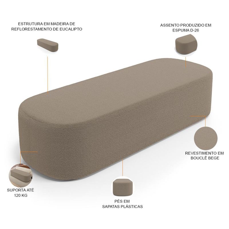 Com um design minimalista, o Puff Decorativo Doha, da Lyam Decor, é sinônimo de modernidade e versatilidade. Com cantos curvos e fluidos, esse puff retangular além de dar um toque de contemporaneidade à decoração, ainda pode ser aproveitado de diversas formas, desde assento extra para a sala de estar à recamier para o quarto, ou ainda como divisor de ambientes para living e outros espaços. Em outras palavras, esse puff orgânico é o complemento perfeito, já que harmoniza facilmente com vários estilos e ambientes, sem contar que oferece conforto e bem-estar. Então, não perca mais tempo e transforme a sua casa com esse puff que transborda beleza e suavidade na medida certa. Adicione agora mesmo ao sei carrinho! Dimensões da Poltrona (L x A x P) 160 x 42 x 60 cm Características: Estrutura em madeira de reflorestamento de eucalipto. Revestimento em Bouclê na cor Bege de alta qualidade. Assento com espuma D-26. Peso suportado: Até 120 kg. Pés em sapatas plásticas. - Por se tratar de estofado as medidas podem ter uma pequena variação de até 3 cm. - A tonalidade do produto real poderá ter ligeira variação devido o lote de tecidos. Observações importantes: - Produto para uso residencial em ambiente interno, não devendo ficar exposto diretamente ao sol, calor e umidade excessivos. - Pode haver alguma diferença de tonalidade entre a imagem e o produto real, por conta do tratamento de imagens e a calibração de cores do seu monitor. - As imagens são meramente ilustrativas, não acompanham objetos de decoração e eletrônicos. - Ao receber a mercadoria, o cliente deve verificar as condições da embalagem, caso haja alguma avaria não assine o comprovante de recebimento e entre em contato com nossa loja para orientações. - Montagem, desmontagem e outras instalações serão de responsabilidade do cliente. Não nos responsabilizamos, no ato da entrega, por subir escadas/elevadores ou pelo transporte por guincho em apartamentos. Eventuais despesas são de responsabilidade do comprador. - Confira as dimensões do produto e certifique-se de que passará normalmente por supostos elevadores, portas, escadas e/ou corredores de sua residência. - Para mais informações, acesse nossa Central de Atendimento.