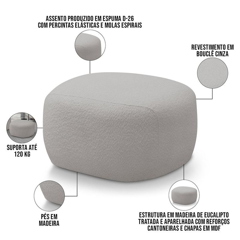 O Puff Decorativo Orgânico Para Sala Living Barolo, da Lyam Decor, é a escolha perfeita para quem procura um design moderno para sua sala de estar ou living. Com design contemporâneo expresso nas linhas curvas, esse puff orgânica combina perfeitamente com uma decoração moderna e elegante, já que a fluidez do design curvo harmoniza facilmente com qualquer ambiente. Já a qualidade alto-padrão fica por conta da tapeçaria feita com espuma alta densidade, enquanto o revestimento em Bouclê garante um toque macio e suave. Se você busca sofisticação e conforto, esse puff retangular é a opção ideal para completar o seu ambiente. Adicione ao seu carrinho e aproveite! Dimensões do Puff (L x A x P) 67 x 42 x 63 cm Características: Estrutura em madeira de eucalipto tratada e aparelhada com reforços, cantoneiras e chapas em MDF. Revestimento em tecido Bouclê de alta qualidade na cor Cinza. Assento composto por espuma D-26 e molas espirais. Percintas elásticas para maior resistência e durabilidade. Pés em madeira. Peso suportado: Até 120 kg. - Nunca sentar nos braços ou encosto do produto. - Por se tratar de estofado as medidas podem ter uma pequena variação de até 3 cm. - A tonalidade do produto real poderá ter ligeira variação devido o lote de tecidos. - Indicado para uso residencial, sua limpeza deve ser feita com pano levemente umedecido em água limpa, sem esfregar, não utilizar produtos abrasivos, desengordurantes, álcool ou solvente. Observações importantes: - Produto para uso residencial em ambiente interno, não devendo ficar exposto diretamente ao sol, calor e umidade excessivos. - Pode haver alguma diferença de tonalidade entre a imagem e o produto real, por conta do tratamento de imagens e a calibração de cores do seu monitor. - As imagens são meramente ilustrativas, não acompanham objetos de decoração e eletrônicos. - Ao receber a mercadoria, o cliente deve verificar as condições da embalagem, caso haja alguma avaria não assine o comprovante de recebimento e entre em contato com nossa loja para orientações. - Montagem, desmontagem e outras instalações serão de responsabilidade do cliente. Não nos responsabilizamos, no ato da entrega, por subir escadas/elevadores ou pelo transporte por guincho em apartamentos. Eventuais despesas são de responsabilidade do comprador. - Confira as dimensões do produto e certifique-se de que passará normalmente por supostos elevadores, portas, escadas e/ou corredores de sua residência. - Para mais informações, acesse nossa Central de Atendimento.