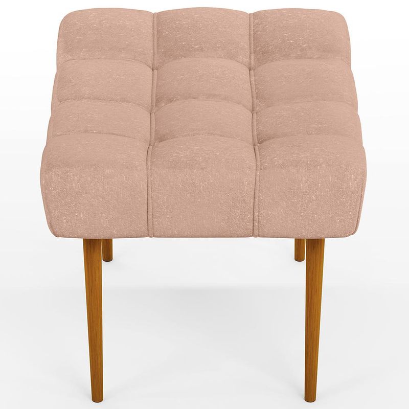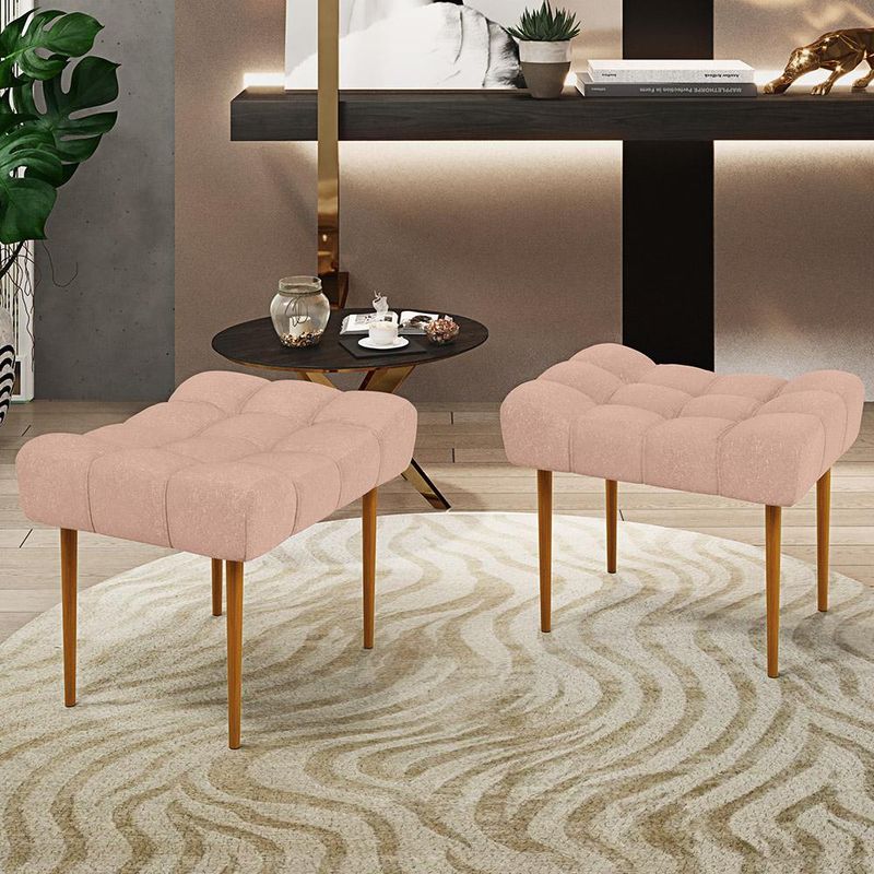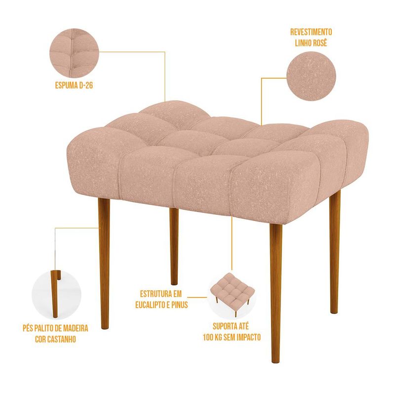 O Puff Decorativo Para Sala De Estar Requinte L02 Linho Rosê - Lyam Decor é ideal para você que busca por elegância e praticidade em sua decoração! Seus pés delicados transmitem suavidade, harmonizando com o assento estofado, que por sua vez é revestido em Linho, tecido de excelente qualidade. Sua versatilidade permite inúmeras composições, seja para complementar a sala de estar com assento extra, na divisão de ambientes integrados, também no quarto servindo de apoio ou combinado à poltronas, as possibilidades são infinitas, ele otimiza seu espaço e proporciona beleza na medida certa. Adquira já o seu! Dimensões do produto (L x A x P) 60 x 49 x 49 cm Altura do assento ao chão: 45 cm Características: Estrutura em madeira reflorestada de eucalipto e pinus. Revestimento em Linho na cor Rosê. Assento fixo com espuma D-26 sobre percintas elásticas. Pés Palito de madeira, na cor Castanho. Suporta até 100kg sem impacto. Montagem prática, apenas rosquear os pés na estrutura. - Por se tratar de estofado as medidas podem ter uma pequena variação de até 3 cm. - A tonalidade do produto real poderá ter ligeira variação devido o lote de tecidos. - A limpeza deve ser feita com pano levemente umedecido em água limpa, sem esfregar, não utilizar produtos abrasivos, desengordurantes, álcool ou solvente. Observações importantes: - Produto para uso residencial em ambiente interno, não devendo ficar exposto diretamente ao sol, calor e umidade excessivos. - Pode haver alguma diferença de tonalidade entre a imagem e o produto real, por conta do tratamento de imagens e a calibração de cores do seu monitor. - As imagens são meramente ilustrativas, não acompanham objetos de decoração e eletrônicos. - Ao receber a mercadoria, o cliente deve verificar as condições da embalagem, caso haja alguma avaria não assine o comprovante de recebimento e entre em contato com nossa loja para orientações. - Montagem, desmontagem e outras instalações serão de responsabilidade do cliente. Não nos responsabilizamos, no ato da entrega, por subir escadas/elevadores ou pelo transporte por guincho em apartamentos. Eventuais despesas são de responsabilidade do comprador. - Confira as dimensões do produto e certifique-se de que passará normalmente por supostos elevadores, portas, escadas e/ou corredores de sua residência.