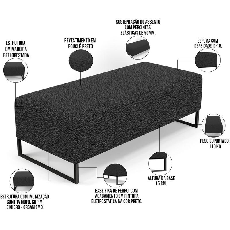 Pensando na praticidade do dia-dia, o Puff Decorativo Sala de Estar Bali W01 Base Ferro 120x50 cm Bouclê Preto - Lyam Decor se faz perfeito para a sua ambientação! É extremamente confortável, ideal para quem procura por funcionalidade e beleza embutidos num único produto. Estruturado com espuma macia e de alta densidade e revestimento de excelente qualidade, além de seus belos pés de metal que arrematam muito bem toda a composição deixando-o ainda mais elegante. Possuindo diferentes funções, pode ser posto em salas de estar, garantindo assentos extras, no quarto, como um apoio ou até mesmo recamier aos pés da cama, em closets, integrando ambientes, dentre outras maneiras. Com certeza irá embelezar ainda mais a decoração do seu lar, garanta já o seu!! Dimensões do produto (L x A x P) 120 x 45 x 50 cm Medidas Internas: Altura do assento: 27 cm Altura dos pés: 15 cm Características: Estrutura em pinus e eucalipto de reflorestamento, com imunização contra mofo, cupim e micro-organismos. Revestimento Bouclê na cor Preto de alta qualidade. Espuma de poliuretano D-18. Base de Ferro, com acabamento em pintura eletrostática na cor preto. Peso suportado: Até 110 kg. Sustentação do assento com percintas elásticas de 50mm. - Por se tratar de estofado as medidas podem ter uma pequena variação de até 3 cm. - A tonalidade do produto real poderá ter ligeira variação devido o lote de tecidos. Observações importantes: - Produto para uso residencial em ambiente interno, não devendo ficar exposto diretamente ao sol, calor e umidade excessivos. - Pode haver alguma diferença de tonalidade entre a imagem e o produto real, por conta do tratamento de imagens e a calibração de cores do seu monitor. - As imagens são meramente ilustrativas, não acompanham objetos de decoração e eletrônicos. - Ao receber a mercadoria, o cliente deve verificar as condições da embalagem, caso haja alguma avaria não assine o comprovante de recebimento. - Montagem, desmontagem e outras instalações serão de responsabilidade do cliente. Não nos responsabilizamos, no ato da entrega, por subir escadas/elevadores ou pelo transporte por guincho em apartamentos. Eventuais despesas são de responsabilidade do comprador. - Confira as dimensões do produto e certifique-se de que passará normalmente por supostos elevadores, portas, escadas e/ou corredores de sua residência.