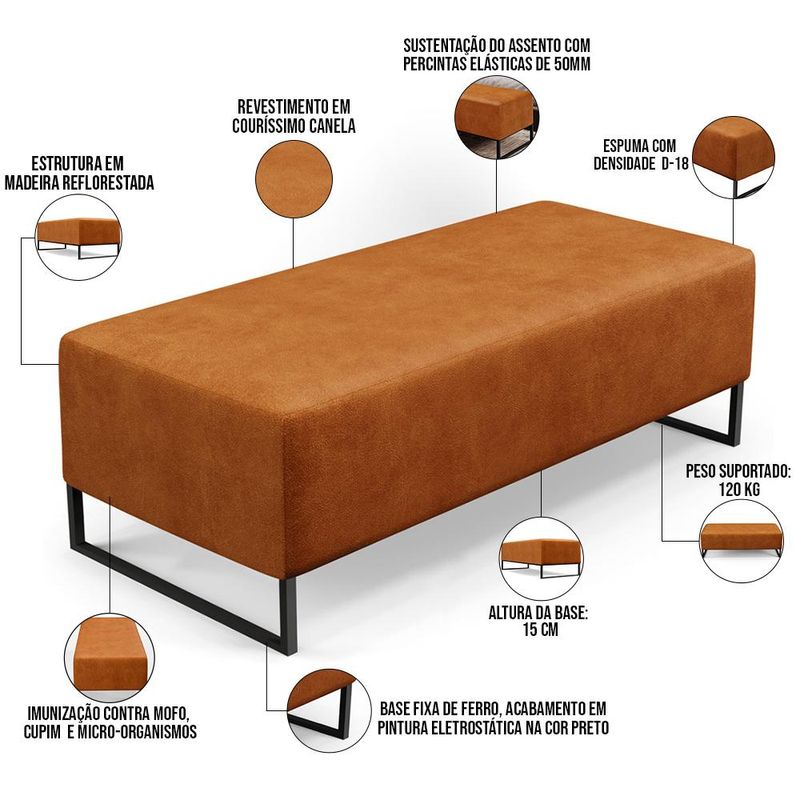 Pensando na praticidade do dia-dia, o Puff Decorativo Sala de Estar Bali W01 Base Ferro 120x50cm - Lyam Decor se faz perfeito para a sua ambientação! É extremamente confortável, ideal para quem procura por funcionalidade e beleza embutidos num único produto. Estruturado com espuma macia e de alta densidade e revestimento de excelente qualidade, além de seus belos pés de metal que arrematam muito bem toda a composição deixando-o ainda mais elegante. Possuindo diferentes funções, pode ser posto em salas de estar, garantindo assentos extras, no quarto, como um apoio ou até mesmo recamier aos pés da cama, em closets, integrando ambientes, dentre outras maneiras. Com certeza irá embelezar ainda mais a decoração do seu lar, garanta já o seu!! Dimensões do produto (L x A x P) 120 x 45 x 50 cm Medidas Internas: Altura do assento: 27 cm Altura dos pés: 15 cm Características: Estrutura em pinus e eucalipto de reflorestamento, com imunização contra mofo, cupim e micro-organismos. Revestimento em Couríssimo na cor Canela. Espuma de poliuretano D-18. Base de Ferro, com acabamento em pintura eletrostática na cor preto. Peso suportado: Até 110 kg. Sustentação do assento com percintas elásticas de 50mm. - Por se tratar de estofado as medidas podem ter uma pequena variação de até 3 cm. - A tonalidade do produto real poderá ter ligeira variação devido o lote de tecidos. Observações importantes: - Produto para uso residencial em ambiente interno, não devendo ficar exposto diretamente ao sol, calor e umidade excessivos. - Pode haver alguma diferença de tonalidade entre a imagem e o produto real, por conta do tratamento de imagens e a calibração de cores do seu monitor. - As imagens são meramente ilustrativas, não acompanham objetos de decoração e eletrônicos. - Ao receber a mercadoria, o cliente deve verificar as condições da embalagem, caso haja alguma avaria não assine o comprovante de recebimento. - Montagem, desmontagem e outras instalações serão de responsabilidade do cliente. Não nos responsabilizamos, no ato da entrega, por subir escadas/elevadores ou pelo transporte por guincho em apartamentos. Eventuais despesas são de responsabilidade do comprador. - Confira as dimensões do produto e certifique-se de que passará normalmente por supostos elevadores, portas, escadas e/ou corredores de sua residência.