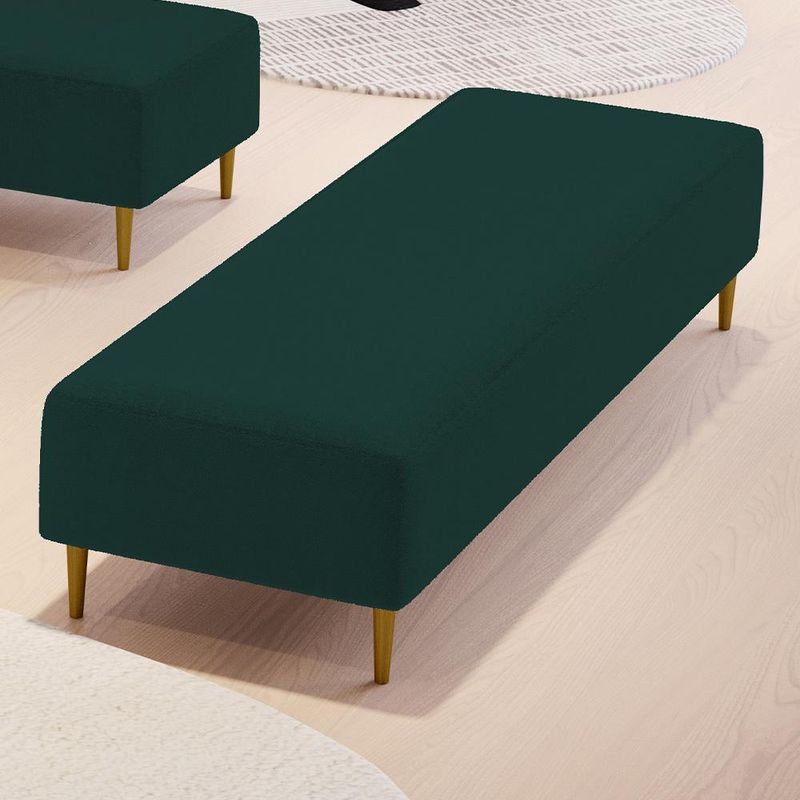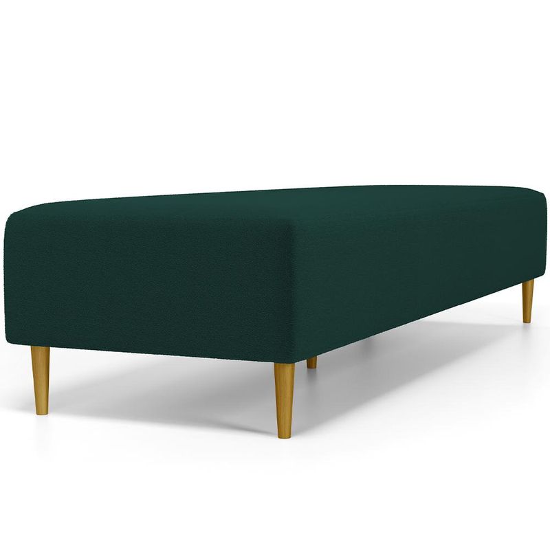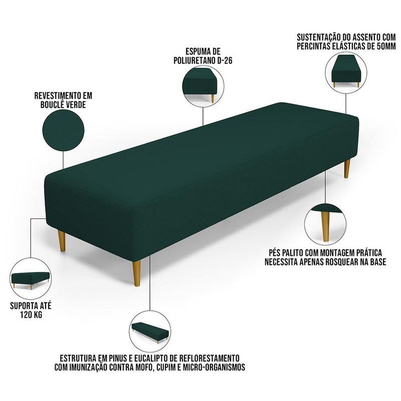 Pensando na praticidade do dia-dia, o Puff Decorativo Bali W01 Pés Palito 170x60cm da Lyam Decor é perfeito para a sua decoração!! É extremamente confortável, ideal para quem procura por funcionalidade e beleza embutidos num único produto. Estruturado com espuma macia e de alta densidade e revestimento de excelente qualidade, além de seus belos pés palito que arrematam muito bem toda a composição deixando-o ainda mais elegante. Possuindo diferentes funções, pode ser posto em salas de estar, garantindo assentos extras, no quarto, como um apoio ou até mesmo recamier aos pés da cama, em closets, integrando ambientes, dentre outras opções. Com certeza vai harmonizar e embelezar ainda mais a decoração do seu lar. Garanta já o seu!!! Dimensões do produto (L x A x P) 170 x 45 x 60 cm Características: Estrutura em pinus e eucalipto de reflorestamento, com imunização contra mofo, cupim e micro-organismos. Revestimento em Bouclê na cor Verde. Espuma de poliuretano D-26. Pés Palito com montagem prática, necessita apenas rosquear na base. Peso suportado: Até 120 kg. Sustentação do assento com percíntas elásticas de 50mm. Altura dos pés: 15 cm. - Por se tratar de estofado as medidas podem ter uma pequena variação de até 3 cm. - A tonalidade do produto real poderá ter ligeira variação devido o lote de tecidos. Observações importantes: - Produto para uso residencial em ambiente interno, não devendo ficar exposto diretamente ao sol, calor e umidade excessivos. - Pode haver alguma diferença de tonalidade entre a imagem e o produto real, por conta do tratamento de imagens e a calibração de cores do seu monitor. - As imagens são meramente ilustrativas, não acompanham objetos de decoração e eletrônicos. - Ao receber a mercadoria, o cliente deve verificar as condições da embalagem, caso haja alguma avaria não assine o comprovante de recebimento. - Montagem, desmontagem e outras instalações serão de responsabilidade do cliente. Não nos responsabilizamos, no ato da entrega, por subir escadas/elevadores ou pelo transporte por guincho em apartamentos. Eventuais despesas são de responsabilidade do comprador. - Confira as dimensões do produto e certifique-se de que passará normalmente por supostos elevadores, portas, escadas e/ou corredores de sua residência.
