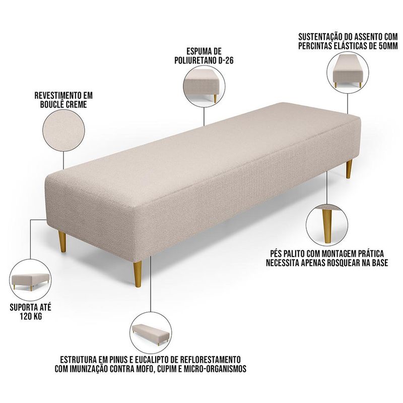 Pensando na praticidade do dia-dia, o Puff Decorativo Bali W01 Pés Palito 190x60cm da Lyam Decor é perfeito para a sua decoração!! É extremamente confortável, ideal para quem procura por funcionalidade e beleza embutidos num único produto. Estruturado com espuma macia e de alta densidade e revestimento de excelente qualidade, além de seus belos pés palito que arrematam muito bem toda a composição deixando-o ainda mais elegante. Possuindo diferentes funções, pode ser posto em salas de estar, garantindo assentos extras, no quarto, como um apoio ou até mesmo recamier aos pés da cama, em closets, integrando ambientes, dentre outras opções. Com certeza vai harmonizar e embelezar ainda mais a decoração do seu lar. Garanta já o seu!!! Dimensões do produto (L x A x P) 190 x 45 x 60 cm Características: Estrutura em pinus e eucalipto de reflorestamento, com imunização contra mofo, cupim e micro-organismos. Revestimento em Bouclê na cor Creme. Espuma de poliuretano D-26. Pés Palito com montagem prática, necessita apenas rosquear na base. Peso suportado: Até 120 kg. Sustentação do assento com percíntas elásticas de 50mm. Altura dos pés: 15 cm. - Por se tratar de estofado as medidas podem ter uma pequena variação de até 3 cm. - A tonalidade do produto real poderá ter ligeira variação devido o lote de tecidos. Observações importantes: - Produto para uso residencial em ambiente interno, não devendo ficar exposto diretamente ao sol, calor e umidade excessivos. - Pode haver alguma diferença de tonalidade entre a imagem e o produto real, por conta do tratamento de imagens e a calibração de cores do seu monitor. - As imagens são meramente ilustrativas, não acompanham objetos de decoração e eletrônicos. - Ao receber a mercadoria, o cliente deve verificar as condições da embalagem, caso haja alguma avaria não assine o comprovante de recebimento. - Montagem, desmontagem e outras instalações serão de responsabilidade do cliente. Não nos responsabilizamos, no ato da entrega, por subir escadas/elevadores ou pelo transporte por guincho em apartamentos. Eventuais despesas são de responsabilidade do comprador. - Confira as dimensões do produto e certifique-se de que passará normalmente por supostos elevadores, portas, escadas e/ou corredores de sua residência.
