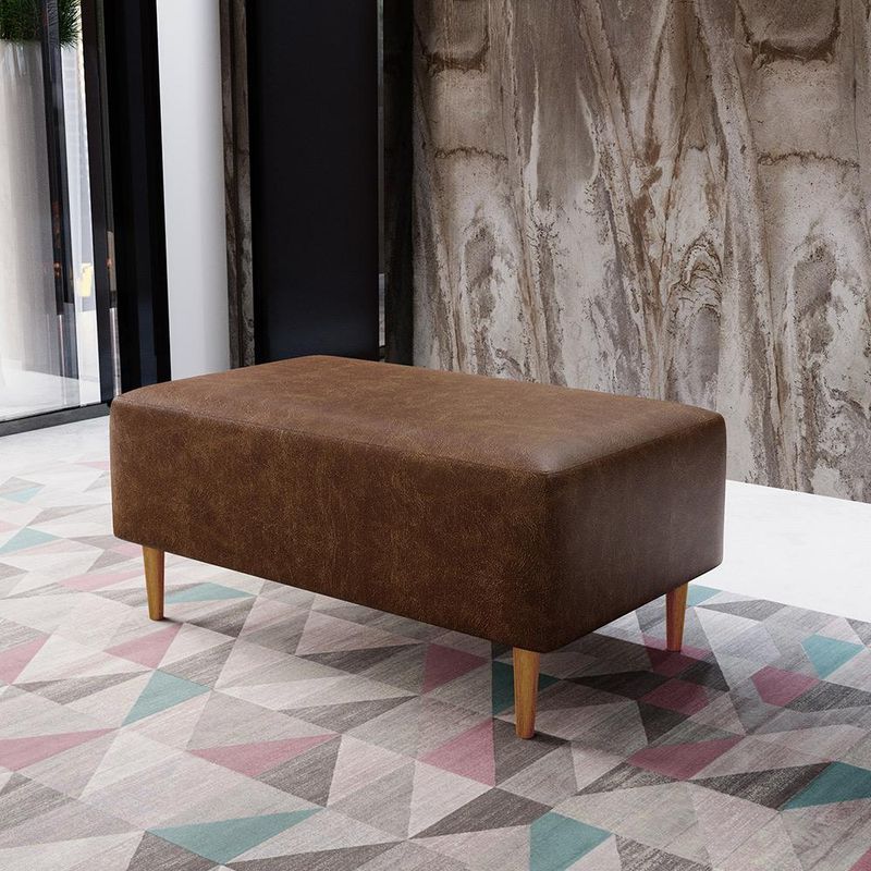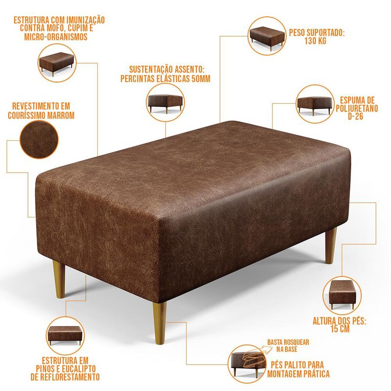 Pensando na praticidade do dia-dia, o Puff Decorativo Sala de Estar Cléo W01 Pés Palito 90 cm Couríssimo Marrom - Lyam Decor se faz perfeito para a sua ambientação!! É extremamente confortável, ideal para quem procura por funcionalidade e beleza embutidos num único produto. Estruturado com espuma macia e de alta densidade e revestimento de excelente qualidade, além de seus belos pés palito que arrematam muito bem toda a composição deixando-o ainda mais elegante. Possuindo diferentes funções, pode ser posto em salas de estar, garantindo assentos extras, no quarto, como um apoio ou até mesmo recamier aos pés da cama, em closets, integrando ambientes, dentre outras maneiras. Com certeza vai harmonizar e embelezar ainda mais a decoração do seu lar. Características: Estrutura em pinus e eucalipto de reflorestamento, com imunização contra mofo, cupim e micro-organismos. Revestimento Couríssimo Marrom de alta qualidade. Espuma de poliuretano D-26. Pés Palito com montagem prática, necessita apenas rosquear na base. Peso suportado: Até 110 kg. Sustentação do assento com percintas elásticas de 50mm. Dimensões do produto (L x A x P) 90 x 42 x 46 cm Altura dos pés: 15 cm. - Por se tratar de estofado as medidas podem ter uma pequena variação de até 3 cm. - A tonalidade do produto real poderá ter ligeira variação devido o lote de tecidos. Observações importantes: - Produto para uso residencial em ambiente interno, não devendo ficar exposto diretamente ao sol, calor e umidade excessivos. - Pode haver alguma diferença de tonalidade entre a imagem e o produto real, por conta do tratamento de imagens e a calibração de cores do seu monitor. - As imagens são meramente ilustrativas, não acompanham objetos de decoração e eletrônicos. - Ao receber a mercadoria, o cliente deve verificar as condições da embalagem, caso haja alguma avaria não assine o comprovante de recebimento. - Montagem, desmontagem e outras instalações serão de responsabilidade do cliente. Não nos responsabilizamos, no ato da entrega, por subir escadas/elevadores ou pelo transporte por guincho em apartamentos. Eventuais despesas são de responsabilidade do comprador. - Confira as dimensões do produto e certifique-se de que passará normalmente por supostos elevadores, portas, escadas e/ou corredores de sua residência.