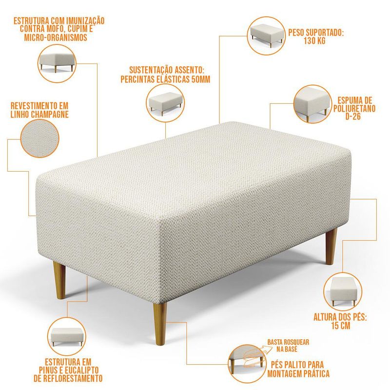 Pensando na praticidade do dia-dia, o Puff Decorativo Sala de Estar Cléo W01 Pés Palito 90 cm Linho Champagne - Lyam Decor se faz perfeito para a sua ambientação!! É extremamente confortável, ideal para quem procura por funcionalidade e beleza embutidos num único produto. Estruturado com espuma macia e de alta densidade e revestimento de excelente qualidade, além de seus belos pés palito que arrematam muito bem toda a composição deixando-o ainda mais elegante. Possuindo diferentes funções, pode ser posto em salas de estar, garantindo assentos extras, no quarto, como um apoio ou até mesmo recamier aos pés da cama, em closets, integrando ambientes, dentre outras maneiras. Com certeza vai harmonizar e embelezar ainda mais a decoração do seu lar, adquira já o seu! Dimensões do produto (L x A x P) 90 x 42 x 46 cm Altura dos pés: 15 cm Características: Estrutura em pinus e eucalipto de reflorestamento, com imunização contra mofo, cupim e micro-organismos. Revestimento Linho Champagne de alta qualidade. Espuma de poliuretano D-26. Pés Palito com montagem prática, necessita apenas rosquear na base. Peso suportado: Até 110 kg. Sustentação do assento com percintas elásticas de 50mm. - Por se tratar de estofado as medidas podem ter uma pequena variação de até 3 cm. - A tonalidade do produto real poderá ter ligeira variação devido o lote de tecidos. Observações importantes: - Produto para uso residencial em ambiente interno, não devendo ficar exposto diretamente ao sol, calor e umidade excessivos. - Pode haver alguma diferença de tonalidade entre a imagem e o produto real, por conta do tratamento de imagens e a calibração de cores do seu monitor. - As imagens são meramente ilustrativas, não acompanham objetos de decoração e eletrônicos. - Ao receber a mercadoria, o cliente deve verificar as condições da embalagem, caso haja alguma avaria não assine o comprovante de recebimento. - Montagem, desmontagem e outras instalações serão de responsabilidade do cliente. Não nos responsabilizamos, no ato da entrega, por subir escadas/elevadores ou pelo transporte por guincho em apartamentos. Eventuais despesas são de responsabilidade do comprador. - Confira as dimensões do produto e certifique-se de que passará normalmente por supostos elevadores, portas, escadas e/ou corredores de sua residência.