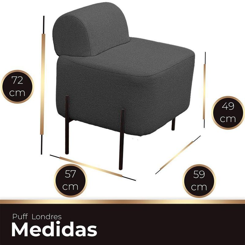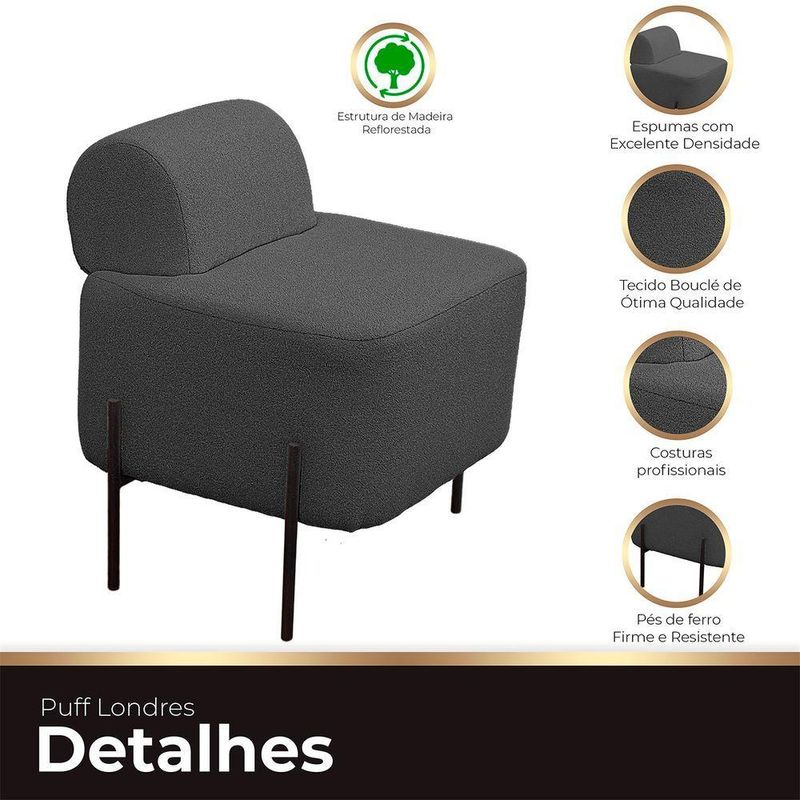 Puff Estofado Virginia Decorativo Tecido Boucle Cor Cinza Chumbo Apresentamos o Puff Virginia, onde conforto e estilo se encontram. Estofado com espuma de alta qualidade e revestido com o elegante tecido Boucle, ele oferece um assento extremamente confortável. Seus pés de ferro adicionam um toque moderno e resistente, tornando-o uma peça duradoura e sofisticada. Ideal para decorar e elevar o charme de qualquer ambiente, seja na sua sala, quarto ou escritório.ESPECIFICAÇÕESMaterial da estrutura: Madeira de reflorestamento;Revestimento: Tecido Boucle;Espuma: D-26;DIMENSÕES DO PUFFAltura total: 0,72cm;Largura total: 0,59cm;Profundidade total: 0,57cm;Peso: 5kg.A GARANTIA É DE FÁBRICANa Ateliê do Conforto, estamos comprometidos em proporcionar a você não apenas produtos de qualidade e sofisticação incomparáveis, mas também uma garantia que reflete nossa confiança no que fazemos.Ao escolher comprar conosco, você recebe não apenas um produto excepcional, mas também a tranquilidade de saber que estamos ao seu lado. Se, por qualquer motivo, seu produto apresentar algum nos próximos noventa dias, como fabricantes, estamos aqui para oferecer total assistência.Nossa prioridade é garantir que sua experiência de compra seja não apenas satisfatória, mas excepcional. Queremos que você tenha a certeza de estar negociando com uma empresa que valoriza, acima de tudo, a confiança mútua com seus clientes. Sua satisfação é a nossa maior recompensa.QUEM SOMOS?Na Ateliê do Conforto, somos especializados em criar cabeceiras, calçadeiras e recamiers de excelência. Localizados em Arapongas, epicentro do setor moveleiro no Sul do país, nossa equipe altamente experiente garante qualidade superior. Escolha nossos produtos para aprimorar seu quarto com beleza e conforto inigualáveisCUIDADOS COM A LIMPEZAUtilizar um pano limpo e seco. Não limpar com produtos abrasivos ou escovas. Não deixar exposta à luz do sol diretamente pois isso irá diminuir a vida útil do produto, fazendo-o envelhecer precocemente. Este produto não é recomendado para ambientes externos onde possa receber chuva.MONTAGEM- O Puff chegará montada para você.INFORMAÇÕES IMPORTANTES- Todos os produtos vão embalados com total ;- A do produto é realizada em todo território , até onde as rodovias alcançam, fluviais ou aéreas devem ser cotadas a parte;- Objetos decorativos que aparecem na foto não acompanham o produto;- Pode haver alguma diferença de tonalidade entre a imagem e o produto real, por conta do tratamento de imagens e a calibração de cores do seu monitor;- Por se tratar de estofado as medidas podem ter uma pequena variação em até 3 cm;- Confira as dimensões do produto e certifique-se de que passará normalmente por supostos elevadores, portas, escadas e/ou corredores de sua residência, já que nossa não inclui a subida de lances de escada, ou o de produtos;- Ao receber a mercadoria, o cliente deve verificar as condições da embalagem, caso haja alguma não assine o de ;- Observando as orientações acima, evita-se futuros desagrados ou imprevistos com a do produto. Havendo despesas adicionais, serão de responsabilidade do cliente.