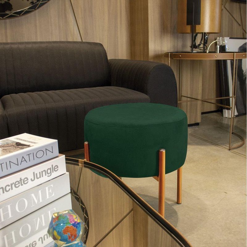 Puff Iron Suede Base Cobre Palito D'rossi Cor VerdeO Puff Iron se apresenta como peça chave para a decoração de sua casa, loja, ou escritório pois agrega um design contemporâneo e descontraído aos ambientes em que for usado. Sem falar do amplo conforto e charme que esse puff trará para seu espaço. Excelente opção para criar um estilo único e se destacar entre seus móveis. A base é charmosa e combina perfeitamente com a almofada redonda, se tornando ideal para receber suas visitas e convidados, proporcionando conforto e modernidade. Dimensões Altura: 45 cm; Largura: 36 cm; Profundidade: 36 cm; Peso: 5 KG; Especificações do Produto Estrutura: Ferro Metalon; Espuma: D-23; Tecido: Suede (100% Poliéster); Tipo de pés: Base Metálica com sapatas plásticas; Peso Suportado: Até 80 Kg; Garantia: 90 dias contra defeito de fabricação; Montagem: O produto vai montado; Instruções de Limpeza: Utilizar um pano limpo e levemente úmido; Você irá receber: 01 volume; Observações Relevantes - Todos os produtos vão embalados com total segurança; - As cores dos produtos podem sofrer alterações dependendo do seu monitor; - Para futuras compras, não garantimos a mesma tonalidade de cor, pois existe variação a cada lote do fabricante do tecido; - As imagens são meramente ilustrativas, não acompanham objetos de decoração e eletros; - Confira as dimensões do produto no momento da compra e certifique-se de que passará normalmente por escadas, elevadores, portas e corredores; - Importante: Por se tratar de estofado as medidas podem ter uma pequena variação em até 3 cm; - Não nos responsabilizamos no ato da entrega por montagens, desmontagens, instalações de produtos; - Não nos responsabilizamos no ato da entrega por subir escadas, elevadores, nem utilização de guinchos ou equipamentos similares para acesso a pisos superiores em apartamentos; - A entrega do produto é realizada em todo território nacional, até onde as rodovias alcançam, entregas fluviais ou aéreas devem ser cotadas a parte; - Observando as orientações acima, evita-se futuros desagrados ou imprevistos com a entrega do produto. Havendo despesas adicionais, serão de responsabilidade do cliente;Informações Técnicas