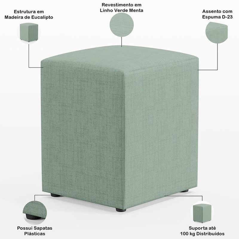 Puff Quadrado Decorativo Sala De Estar L02 Linho Verde Menta - Lyam DecorO Puff Quadrado Decorativo L02 Linho Verde menta - Lyam Decor é ideal para você que busca por elegância e praticidade em sua decoração! É estruturado com madeira de eucalipto e revestido em Linho, tecido de excelente qualidade. Sua versatilidade permite inúmeras composições, seja para complementar a sala de estar garantindo assentos extras e apoio para os pés, na divisão de ambientes integrados, também para o quarto e closet servindo de apoio ou combinado à poltronas, as possibilidades são infinitas, ele otimiza seu espaço e proporciona beleza na medida certa. Adquira já o seu!Dimensões do produto (L x A x P) 35 x 42 x 35 cmCaracterísticas: Estrutura em madeira reflorestada de eucalipto, pinus, compensado e MDF. Revestimento em Linho Verde menta. Pés em sapatas plásticas. Suporta até 100 kg sem impacto.- Por se tratar de estofado as medidas podem ter uma pequena variação de até 3 cm. - A tonalidade do produto real poderá ter ligeira variação devido o lote de tecidos. - A limpeza deve ser feita com pano levemente umedecido em água limpa, sem esfregar, não utilizar produtos abrasivos, desengordurantes, álcool ou solvente.Observações importantes: - Produto para uso residencial em ambiente interno, não devendo ficar exposto diretamente ao sol, calor e umidade excessivos. - Pode haver alguma diferença de tonalidade entre a imagem e o produto real, por conta do tratamento de imagens e a calibração de cores do seu monitor. - As imagens são meramente ilustrativas, não acompanham objetos de decoração e eletrônicos. - Ao receber a mercadoria, o cliente deve verificar as condições da embalagem, caso haja alguma avaria não assine o comprovante de recebimento. - Montagem, desmontagem e outras instalações serão de responsabilidade do cliente. Não nos responsabilizamos, no ato da entrega, por subir escadas/elevadores ou pelo transporte por guincho em apartamentos. Eventuais despesas são de responsabilidade do comprador. - Confira as dimensões do produto e certifique-se de que passará normalmente por supostos elevadores, portas, escadas e/ou corredores de sua residência. Color: Verde | ColorFamily: Verde | ColorSimple: Verde | ColorSupplier: Verde Menta | Material: Estrutura em Madeira, MDF, Revestimento em Linho e espuma | MaterialFamily: Madeira, MDF, Linho e espuma | Model: Quadrado | OriginCountry: Brasil | OriginState: PR | ProductContents: 1 Puff | SizeDescription: Altura: 42 cm x Largura: 35 cm x Profundidade: 35 cm | SupplierSimpleName: Puff Quadrado Decorativo Sala De Estar L02 Linho Verde Menta - Lyam Decor | ProductLength: 35 cm | ProductWidth: 35 cm | ProductWarranty: 90 dias após o recebimento do produto | ProductHeight: 42 cm | ProductInstructions: Produto para uso em ambiente interno, nao devendo ficar exposto ao sol, calor e umidade excessivos. | ProductWeight: 45 kg | Cor: Verde | Altura: 42 cm | Forma: Quadrado | Largura: 35 cm | Estilo: Clássico | Formato de venda: Unidade | Desenho do tecido: Liso | É dobrável: Não | Com pés: Sim | Quantidade de pés: 4 | Peso máximo suportado: 100 kg | Unidades por kit: 1