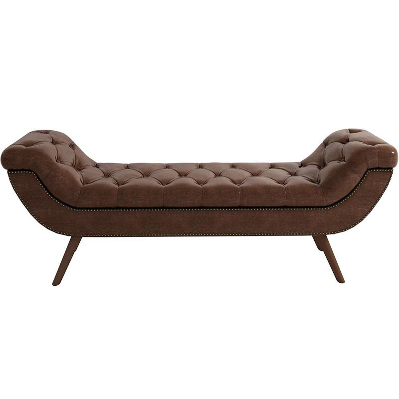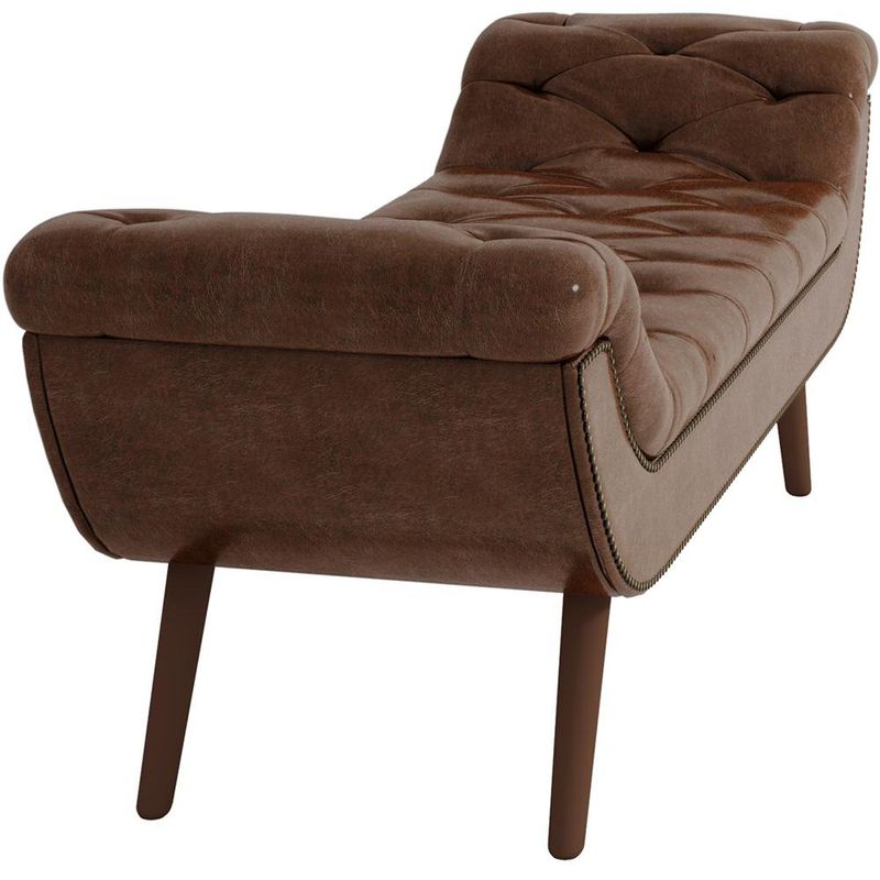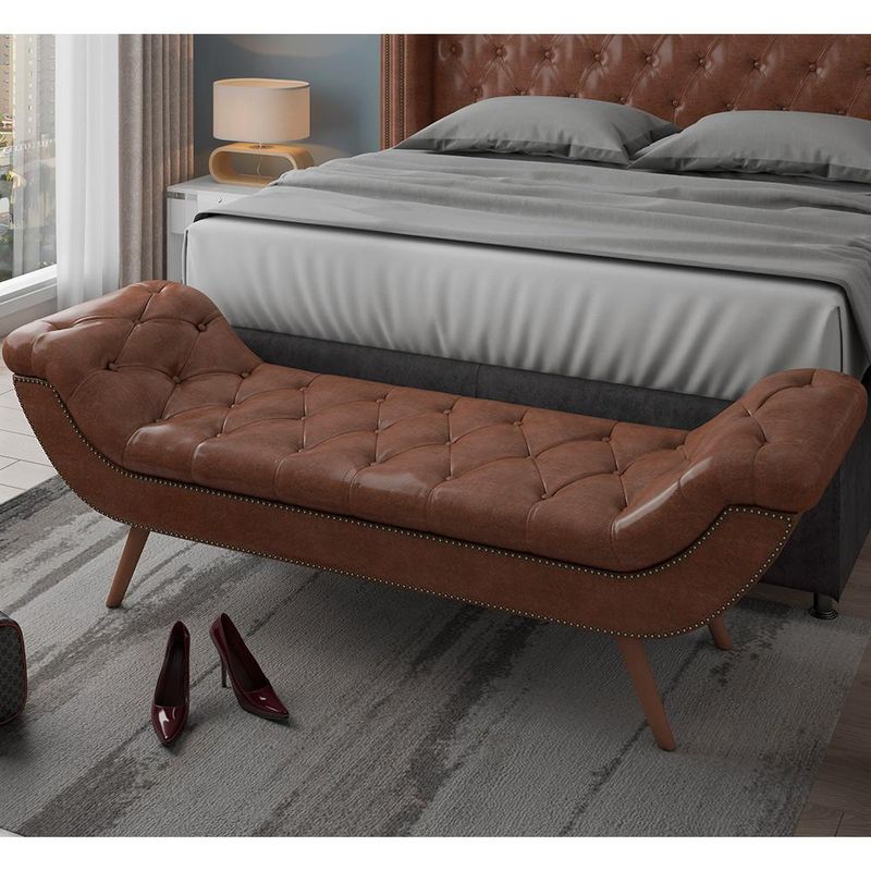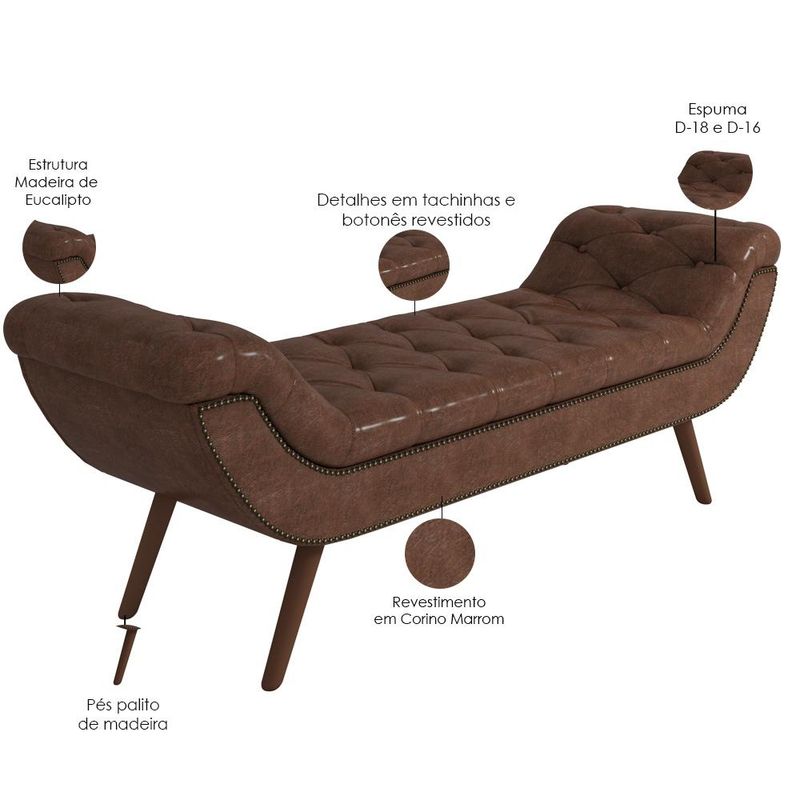 O Puff Recamier Decorativo com Tachas 195 cm Santorini P05 Corino Marrom - Lyam Decor é uma peça singular e elegante. Com design moderno, traz destaque e beleza na hora de compor seu quarto. Seus detalhes em tachas e botonê, denotam todo o cuidado e carinho na hora da produção. Com materiais de excelente qualidade e acabamento impecável, seus pés em madeira e revestimento em Corino combina majestosamente com o restante da mobília. Para ambientes clássicos e refinados, é a composição perfeita para os amantes da elegância! Você merece o melhor, garanta já a sua!! Dimensões do produto (L x A x P) 195 x 60 x 52 cm Medidas Internas: Altura do assento: 40 cm Altura dos pés: 22 cm Características: Estrutura em madeira de eucalipto. Revestimento Corino na cor Marrom. Espuma D-18/D-16. Base pés palito de madeira. Botonê revestido. Contorno com Tachinhas. - Por se tratar de estofado as medidas podem ter uma pequena variação de até 3 cm. - A tonalidade do produto real poderá ter ligeira variação devido o lote de tecidos. Observações importantes: - Produto para uso residencial em ambiente interno, não devendo ficar exposto diretamente ao sol, calor e umidade excessivos. - Pode haver alguma diferença de tonalidade entre a imagem e o produto real, por conta do tratamento de imagens e a calibração de cores do seu monitor. - As imagens são meramente ilustrativas, não acompanham objetos de decoração e eletrônicos. - Ao receber a mercadoria, o cliente deve verificar as condições da embalagem, caso haja alguma avaria não assine o comprovante de recebimento. - Montagem, desmontagem e outras instalações serão de responsabilidade do cliente. Não nos responsabilizamos, no ato da entrega, por subir escadas/elevadores ou pelo transporte por guincho em apartamentos. Eventuais despesas são de responsabilidade do comprador. - Confira as dimensões do produto e certifique-se de que passará normalmente por supostos elevadores, portas, escadas e/ou corredores de sua residência.
